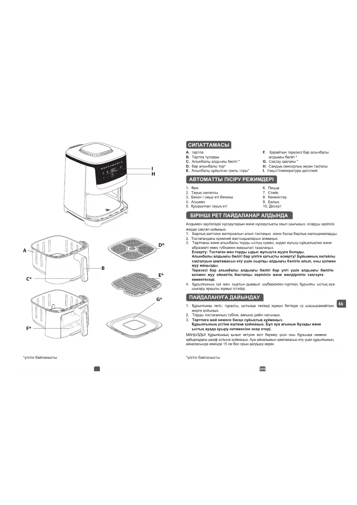 *үлгіге байланысты СИПАТТАМАСЫ A. тартпа B. Тартпа тұтқары C. Алынбалы алдыңғы бөлігі * D. бар алынбалы тор* E. Алынбалы құйылған гриль торы* F. Қарайтын терезесі бар алынбалы алдыңғы бөлігі * G. Сақтау қақпағы * H. Сандық сенсорлық экран тақтасы