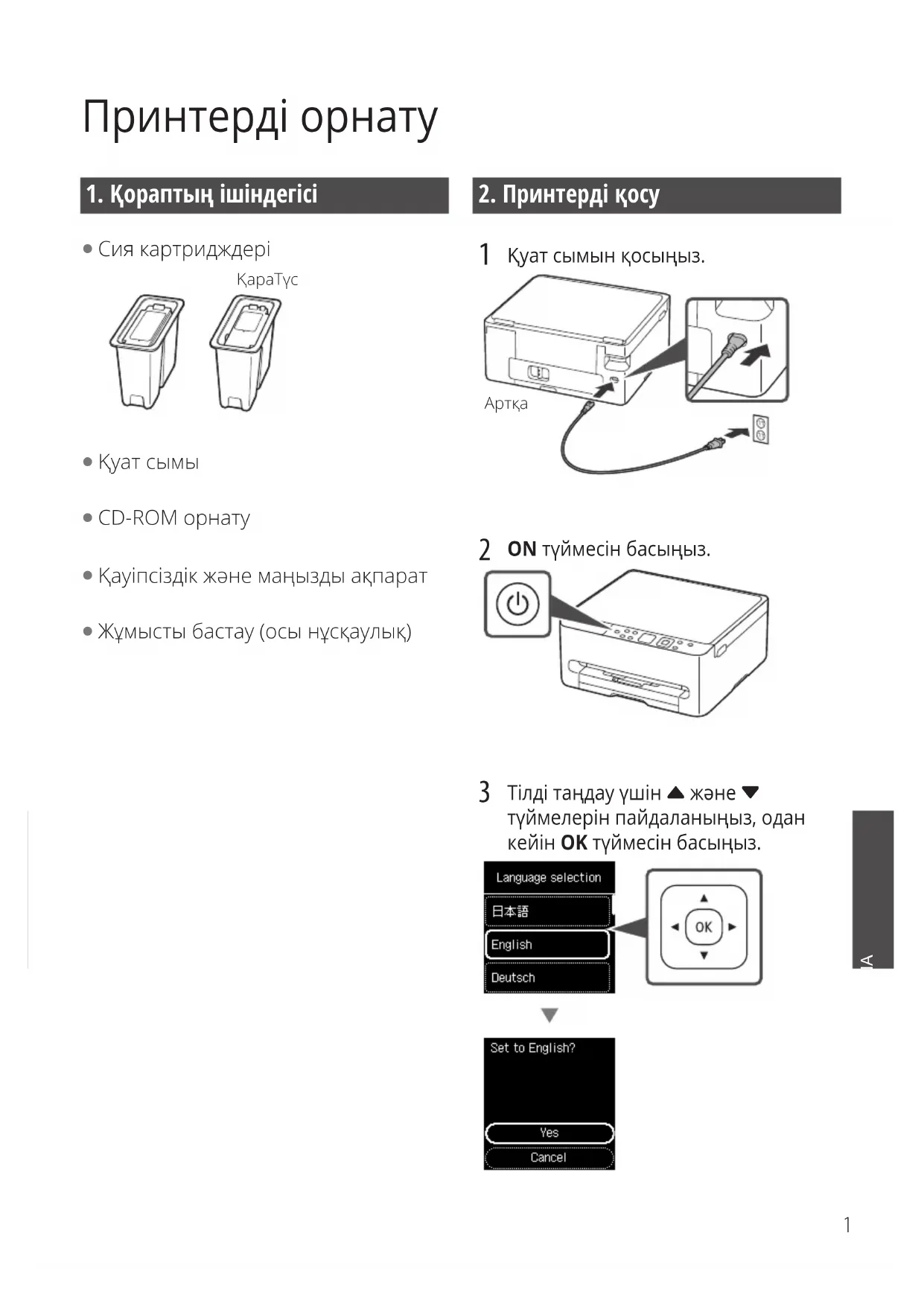 Қуат сымын қосыңыз.Артқа ON түймесін басыңыз. Тілді таңдау үшін { және } түймелерін пайдаланыңыз, одан кейін OK түймесін басыңыз.2
