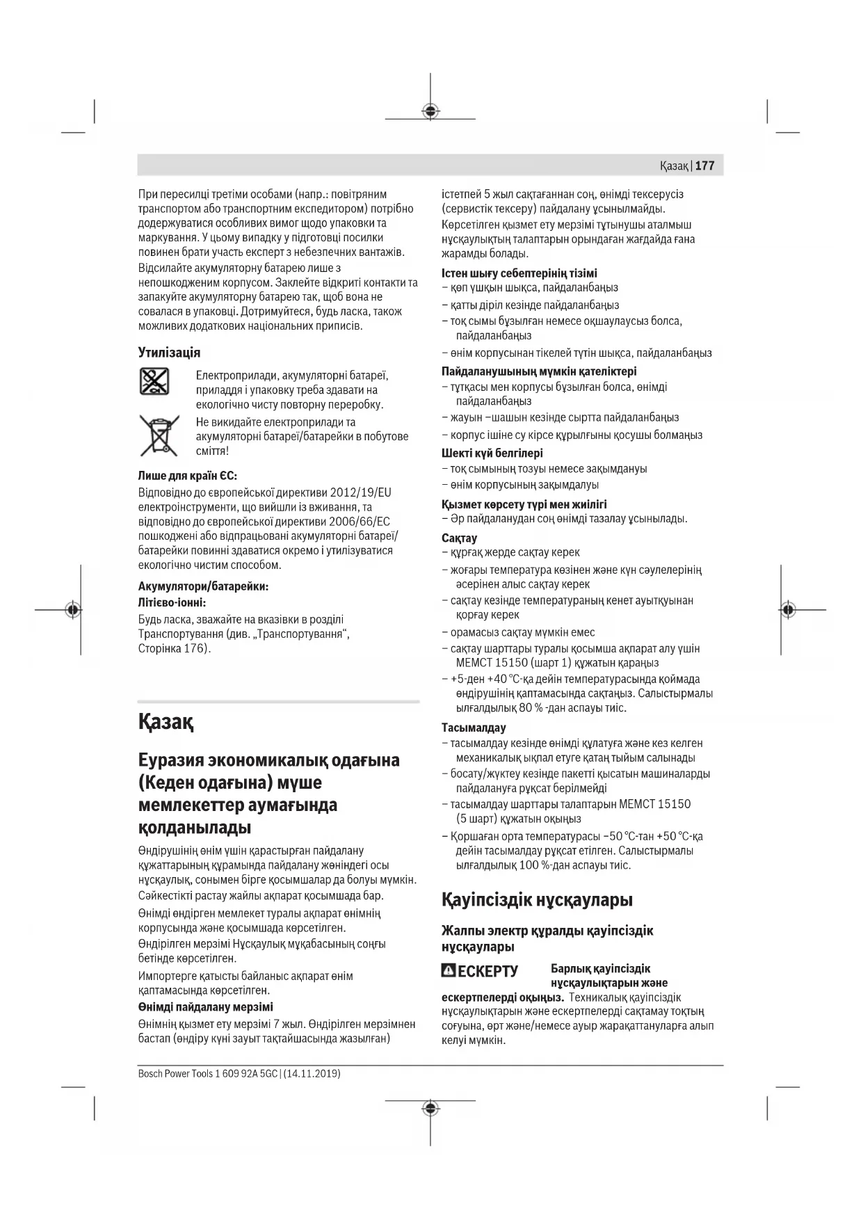 Барлық қауіпсіздік нұсқаулықтарын және ескертпелерді оқыңыз. Техникалық қауіпсіздік нұсқаулықтарын және ескертпелерді сақтамау тоқтың соғуына, өрт және/немесе ауыр жарақаттануларға алып келуі мүмкін. Bosch Power Tools 1 609 92A 5GC | (14.11.2019)178 | Қазақ Болашақ жұмыстар үшін қауіпсіздік нұсқаулықтары мен ескертпелерді сақтап қойыңыз. Қауіпсіздік нұсқаулықтарында пайдаланылған Электр құрал атауының желіден қуат алатын электр құралдарына (желілік кабелі менен) және аккумуляторден қуат алатын электр құралдарына (желілік кабелі жоқ) қатысы бар. Жұмыс орнының қауіпсіздігі u Жұмыс орнын таза және жарық ұстаңыз. Ластанған және қараңғы жайларда сәтсіз оқиғалар болуы мүмкін. u Электр құрылғысын жарылатын атмосферада пайдаланбаңыз, мысалы, жанатын сұйықтық, газ немесе шаң бар болғанда. Электр құрал ұшқындарды жасайды, ал олар шаң немесе буларды жандыруы