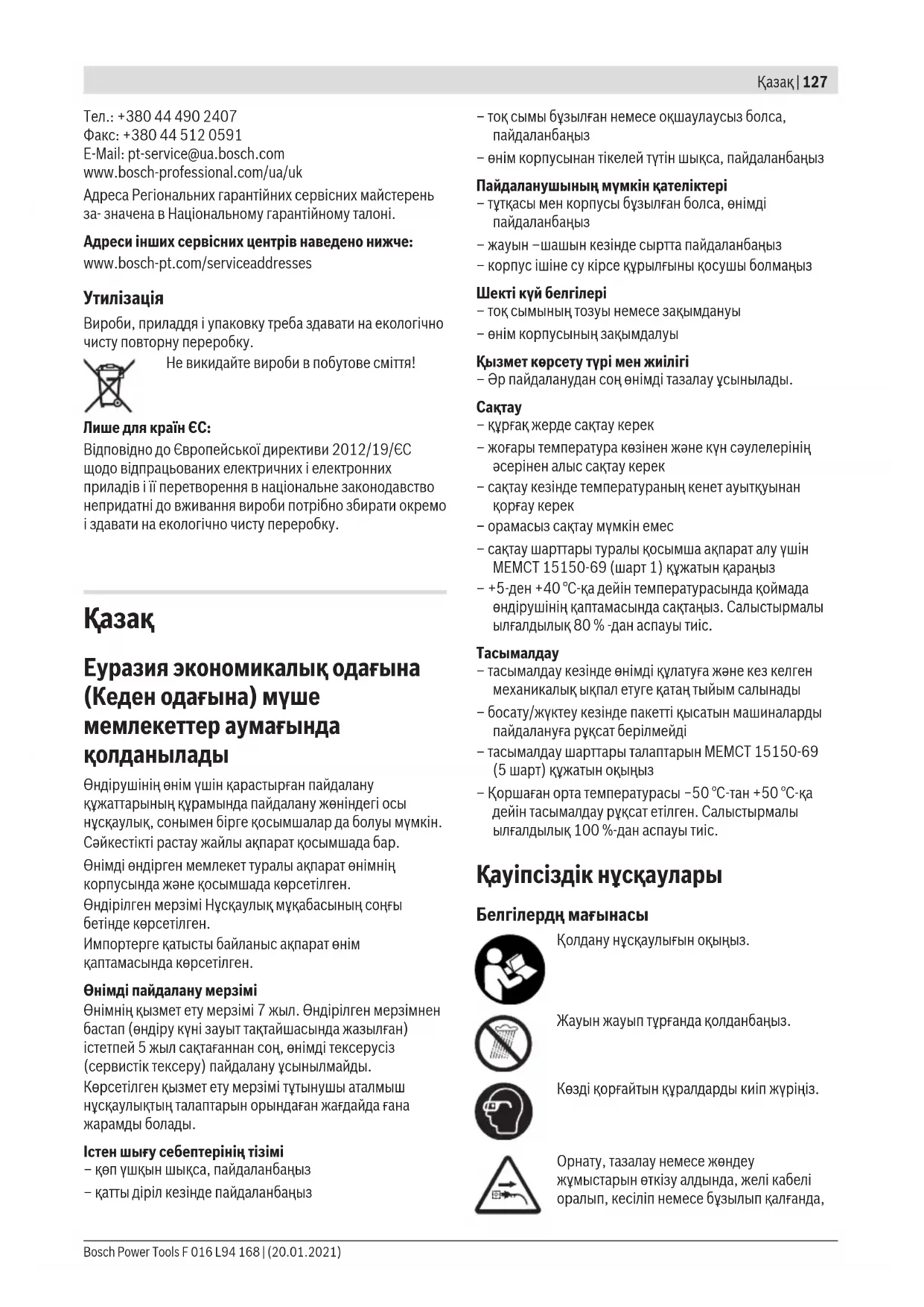 – тасымалдау кезінде өнімді құлатуға және кез келген механикалық ықпал етуге қатаң тыйым салынады – босату/жүктеу кезінде пакетті қысатын машиналарды пайдалануға рұқсат берілмейді – тасымалдау шарттары талаптарын МЕМСТ15150-69 (5шарт) құжатын оқыңыз – Қоршаған орта температурасы −50°С-тан +50°С-қа дейін тасымалдау рұқсат етілген. Салыстырмалы ылғалдылық 100%-дан аспауы тиіс. Қауіпсіздік нұсқаулары Белгілердң мағынасы Қолдану нұсқаулығын оқыңыз. Жауын жауып тұрғанда қолданбаңыз. Көзді қорғайтын құралдарды киіп жүріңіз. Орнату, тазалау немесе жөндеу жұмыстарын өткізу алдында, желі кабелі оралып, кесіліп немесе бұзылып қалғанда, Bosch Power Tools F 016 L94 168 | (20.01.2021)128 | Қазақ немесе электр бұйымды бақылаусыз қалдырғаныңызда бақ электр бұйымын өшіріп алып, желі ашасын желі розеткасынан шығарып қойыңыз. Қолдарыңызды пышақтан ұзақта ұстаңыз. Электр құралдары үшін жалпы қауіпсіздік