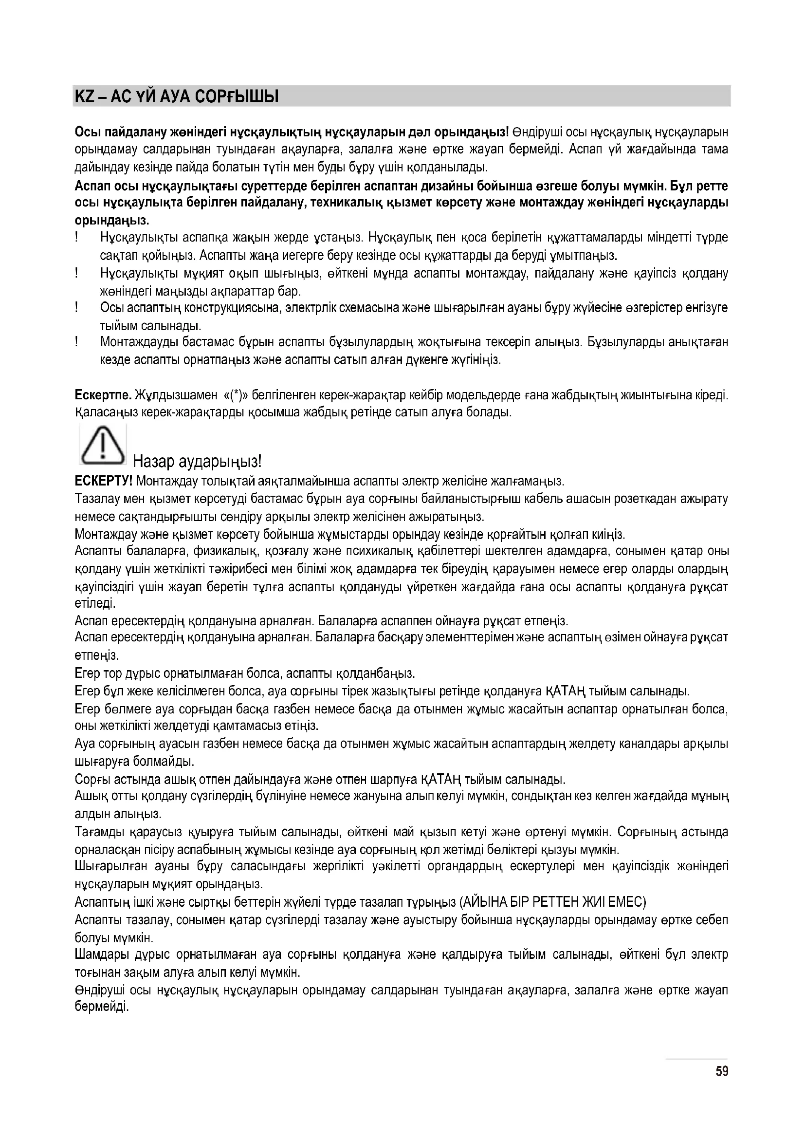 58KZ – АС ҮЙ АУА СОРҒЫШЫ Осы пайдалану жөніндегі нұсқаулықтың нұсқауларын дәл орындаңыз! Өндіруші осы нұсқаулық нұсқауларын орындамау салдарынан туындаған ақауларға, залалға және өртке жауап бермейді. Аспап үй жағдайында тама дайындау кезінде пайда болатын түтін мен буды бұру үшін қолданылады. Аспап осы нұсқаулықтағы суреттерде берілген аспаптан дизайны бойынша өзгеше болуы мүмкін. Бұл ретте осы нұсқаулықта берілген пайдалану, техник алық қызмет көрсету және монтаждау жөніндегі нұсқауларды