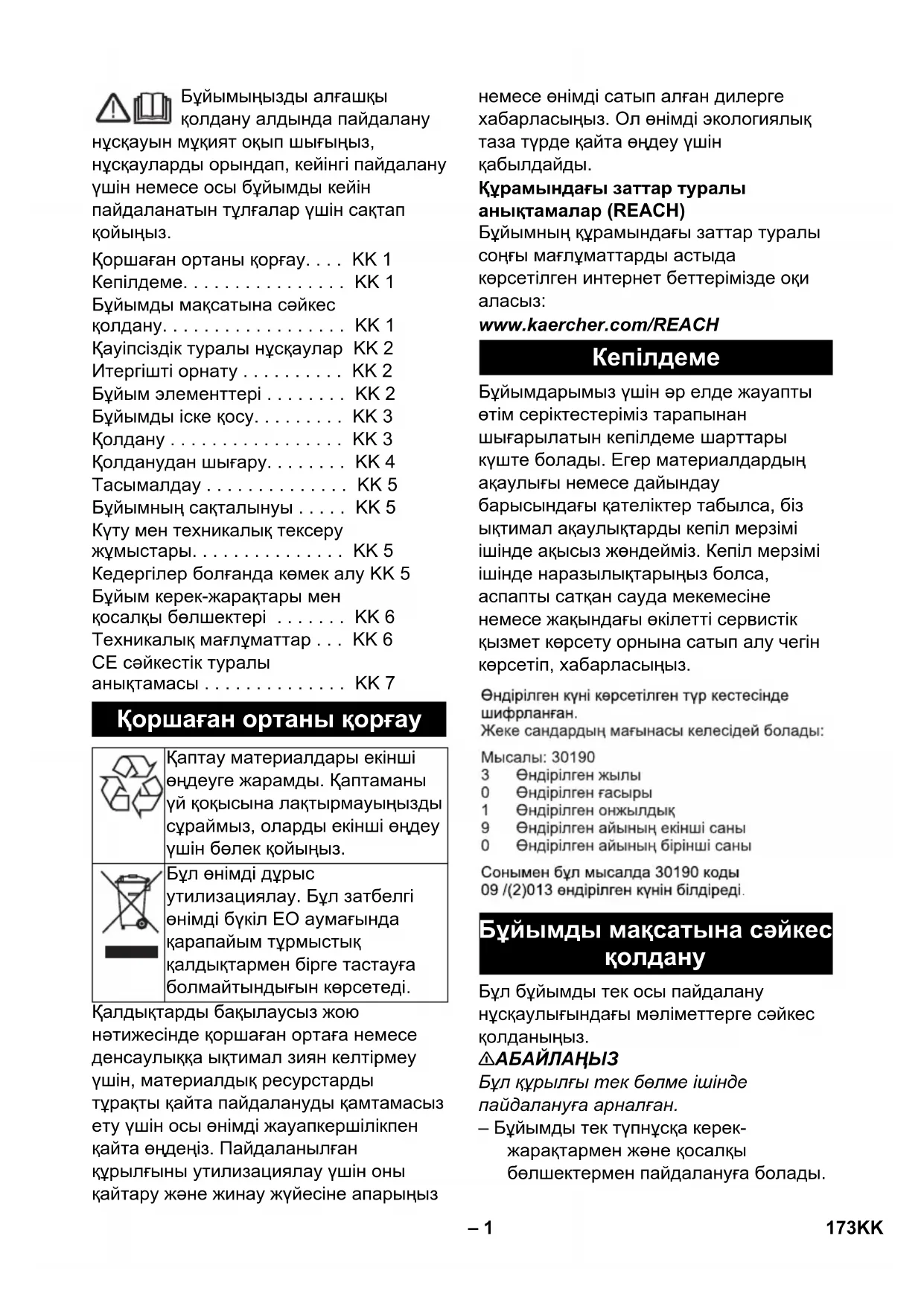 www.kaercher.com/REACH Бұйымдарымыз үшін әр елде жауапты өтім серіктестеріміз тарапынан шығарылатын кепілдеме шарттары күште болады. Егер материалдардың ақаулығы немесе дайындау барысындағы қателіктер табылса, біз ықтимал ақаулықтарды кепіл мерзімі ішінде ақысыз жөндейміз. Кепіл мерзімі ішінде наразылықтарыңыз болса, аспапты сатқан сауда мекемесіне немесе жақындағы өкілетті сервистік қызмет көрсету орнына сатып алу чегін көрсетіп, хабарласыңыз. Бұл бұйымды тек осы пайдалану нұсқаулығындағы мәліметтерге сәйкес қолданыңыз. 몇 АБАЙЛАҢЫЗ Бұл құрылғы тек бөлме ішінде пайдалануға арналған. – Бұйымды тек түпнұсқа керек- жарақтармен және қосалқы бөлшектермен пайдалануға болады. Қоршаған ортаны қорғау. . . . KK 1 Кепілдеме. . . . . . . . . . . . . . . . KK 1 Бұйымды мақсатына сәйкес қолдану. . . . . . . . . . . . . . . . . . KK 1 Қауіпсіздік туралы нұсқаулар KK 2 Итергішті орнату . . . . . . . . . . KK 2 Бұйым элементтері . . . . . . . . KK 2 Бұйымды іске қосу. . . . . . . . . KK 3 Қолдану . . . . . . . . . . . . . . . . . KK 3 Қолданудан шығару. . . . . . . . KK 4 Тасымалдау . . . . . . . . . . . . . . KK 5 Бұйымның сақталынуы . . . . . KK 5 Күту мен техникалық тексеру жұмыстары. . . . . . . . . . . . . . . KK 5 Кедергілер болғанда көмек алу KK 5 Бұйым керек-жарақтары мен қосалқы бөлшектері . . . . . . . KK 6 Техникалық мағлұматтар . . . KK 6 СЕ сәйкестік туралы анықтамасы . . . . . . . . . . . . . . KK 7 Қоршаған ортаны қорғау Қаптау материалдары екінші өңдеуге жарамды. Қаптаманы үй қоқысына лақтырмауыңызды сұраймыз, оларды екінші өңдеу үшін бөлек қойыңыз. Бұл өнімді дұрыс утилизациялау. Бұл затбелгі өнімді бүкіл ЕО аумағында қарапайым тұрмыстық қалдықтармен бірге тастауға болмайтындығын көрсетеді.