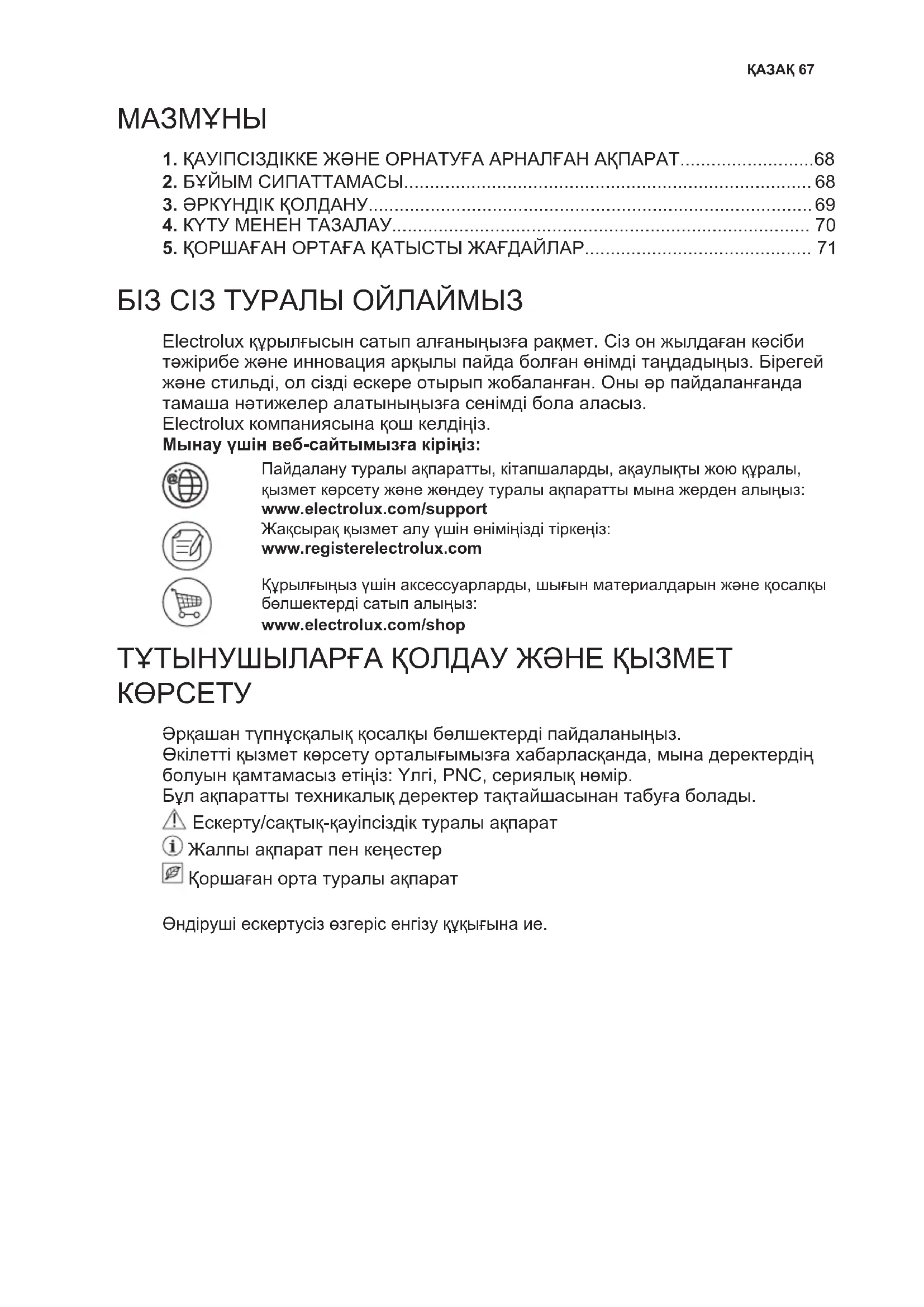 БІЗ СІЗ ТУРАЛЫ ОЙЛАЙМЫЗ Electrolux құрылғысын сатып алғаныңызға рақмет. Сіз он жылдаған кәсіби тәжірибе және инновация арқылы пайда болған өнімді таңдадыңыз. Бірегей және стильді, ол сізді ескере отырып жобаланған. Оны әр пайдаланғанда тамаша нәтижелер алатыныңызға сенімді бола аласыз. Electrolux компаниясына қош келдіңіз. Мынау үшін веб-сайтымызға кіріңіз: Пайдалану туралы ақпаратты, кітапшаларды, ақаулықты жою құралы, қызмет көрсету және жөндеу туралы ақпаратты мына жерден алыңыз: www.electrolux.com/support Жақсырақ қызмет алу үшін өніміңізді тіркеңіз: www.registerelectrolux.com Құрылғыңыз үшін аксессуарларды, шығын материалдарын және қосалқы бөлшектерді сатып алыңыз: www.electrolux.com/shop ТҰТЫНУШЫЛАРҒА ҚОЛДАУ ЖӘНЕ ҚЫЗМЕТ