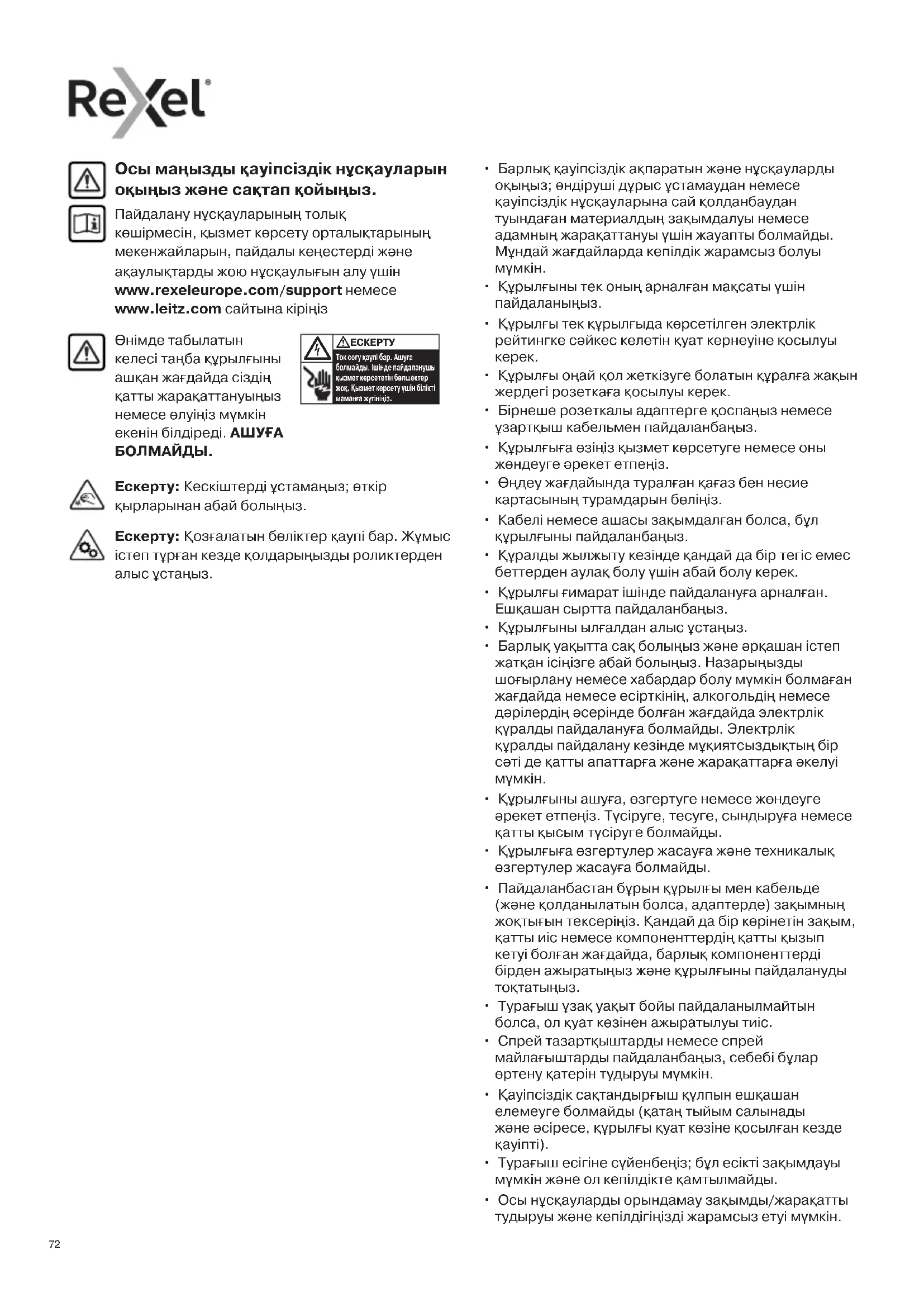 - Осы нұсқауларды орындамау зақымды/жарақатты тудыруы және кепілдігіңізді жарамсыз етуі мүмкін. Осы маңызды қауіпсіздік нұсқауларын оқыңыз және сақтап қойыңыз. Пайдалану нұсқауларының толық көшірмесін, қызмет көрсету орталықтарының мекенжайларын, пайдалы кеңестерді және ақаулықтарды жою нұсқаулығын алу үшін www.rexeleurope.com/support немесе www.leitz.com сайтына кіріңіз Ескерту: Кескіштерді ұстамаңыз; өткір қырларынан абай болыңыз. Ескерту: Қозғалатын бөліктер қаупі бар. Жұмыс істеп тұрған кезде қолдарыңызды роликтерден алыс ұстаңыз.737373 Бос әшекейлерді жақындатпаңыз Галстуктер мен бос киімдерді жақындатпаңыз Ескерту таңбалары Ұзын шашты жақындатпаңыз Беру саңылауына жақындамаңыз Ескерту таңбалары Парақ сыйымдылығы Ықшам дискілерді салуға болмайды 26 мм-ден жоғары ешқандай үлкен қапсырмалар болмауы керек Ескерту: қозғалатын бөліктер Бұл құрал балалардың пайдалануына