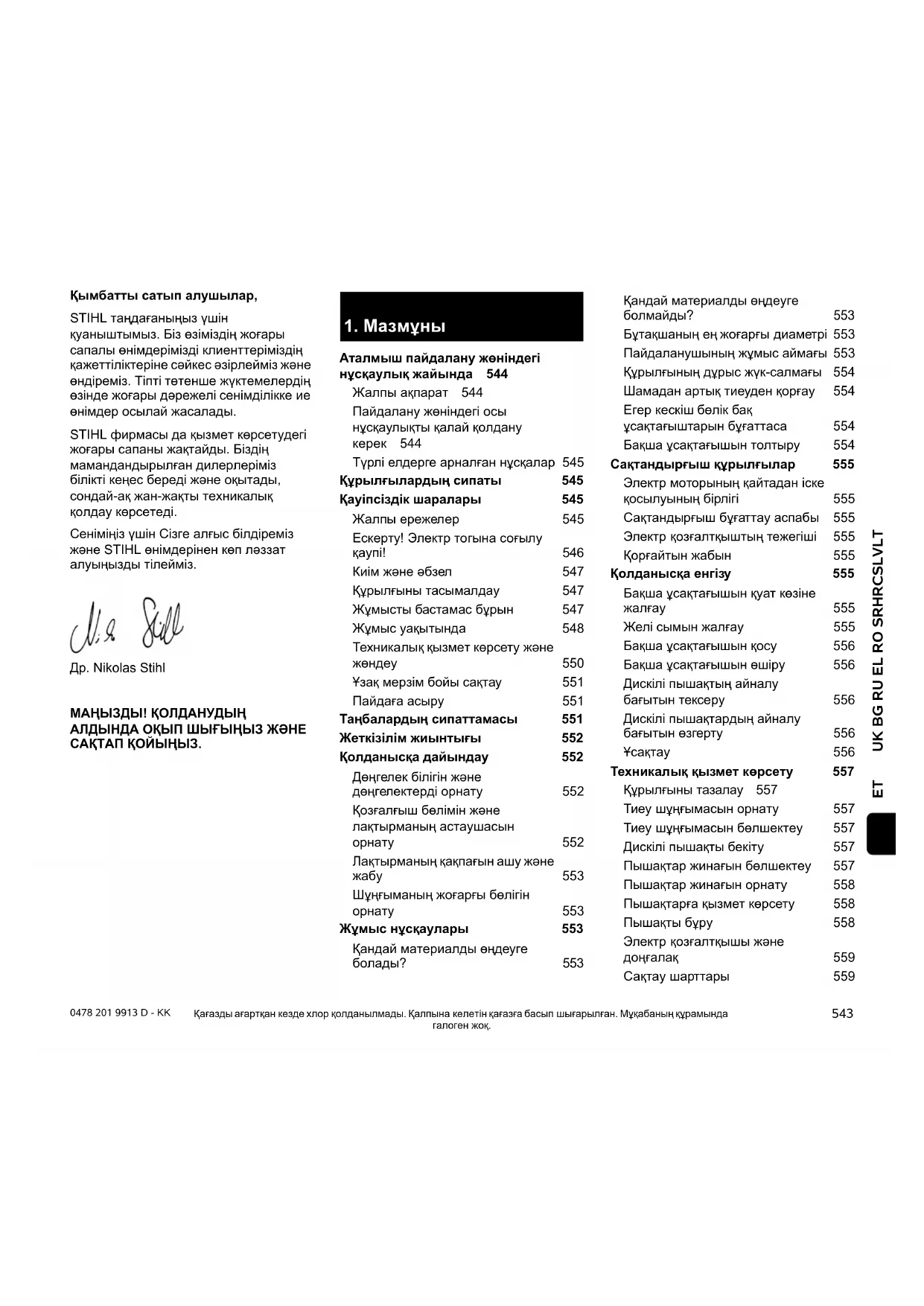 Қымбатты сатып алушылар, STIHL таңдағаныңыз үшін қуаныштымыз. Біз өзіміздің жоғары сапалы өнімдерімізді клиенттеріміздің қажеттіліктеріне сəйкес əзірлейміз жəне өндіреміз. Тіпті төтенше жүктемелердің өзінде жоғары дəрежелі сенімділікке ие өнімдер осылай жасалады. STIHL фирмасы да қызмет көрсетудегі жоғары сапаны жақтайды. Біздің мамандандырылған дилерлеріміз білікті кеңес береді жəне оқытады, сондай-ақ жан-жақты техникалық қолдау көрсетеді. Сеніміңіз үшін Сізге алғыс білдіреміз жəне STIHL өнімдерінен көп лəззат алуыңызды тілейміз. Др. Nikolas Stihl МАҢЫЗДЫ! ҚОЛДАНУДЫҢ АЛДЫНДА ОҚЫП ШЫҒЫҢЫЗ ЖƏНЕ САҚТАП ҚОЙЫҢЫЗ. Қағазды ағартқан кезде хлор қолданылмады. Қалпына келетін қағазға басып шығарылған. Мұқабаның құрамында галоген жоқ.