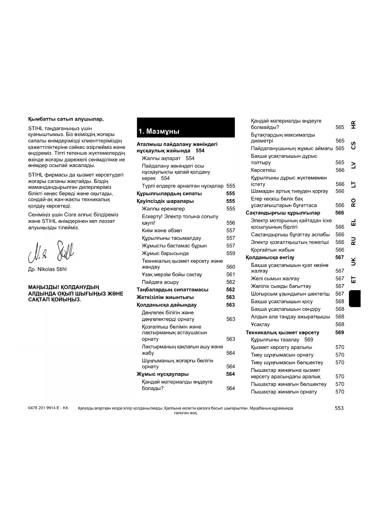 Қымбатты сатып алушылар, STIHL таңдағаныңыз үшін қуаныштымыз. Біз өзіміздің жоғары сапалы өнімдерімізді клиенттеріміздің қажеттіліктеріне сəйкес əзірлейміз жəне өндіреміз. Тіпті төтенше жүктемелердің өзінде жоғары дəрежелі сенімділікке ие өнімдер осылай жасалады. STIHL фирмасы да қызмет көрсетудегі жоғары сапаны жақтайды. Біздің мамандандырылған дилерлеріміз білікті кеңес береді жəне оқытады, сондай-ақ жан-жақты техникалық қолдау көрсетеді. Сеніміңіз үшін Сізге алғыс білдіреміз жəне STIHL өнімдерінен көп лəззат алуыңызды тілейміз. Др. Nikolas Stihl МАҢЫЗДЫ! ҚОЛДАНУДЫҢ АЛДЫНДА ОҚЫП ШЫҒЫҢЫЗ ЖƏНЕ САҚТАП ҚОЙЫҢЫЗ. Қағазды ағартқан кезде хлор қолданылмады. Қалпына келетін қағазға басып шығарылған. Мұқабаның құрамында галоген жоқ.