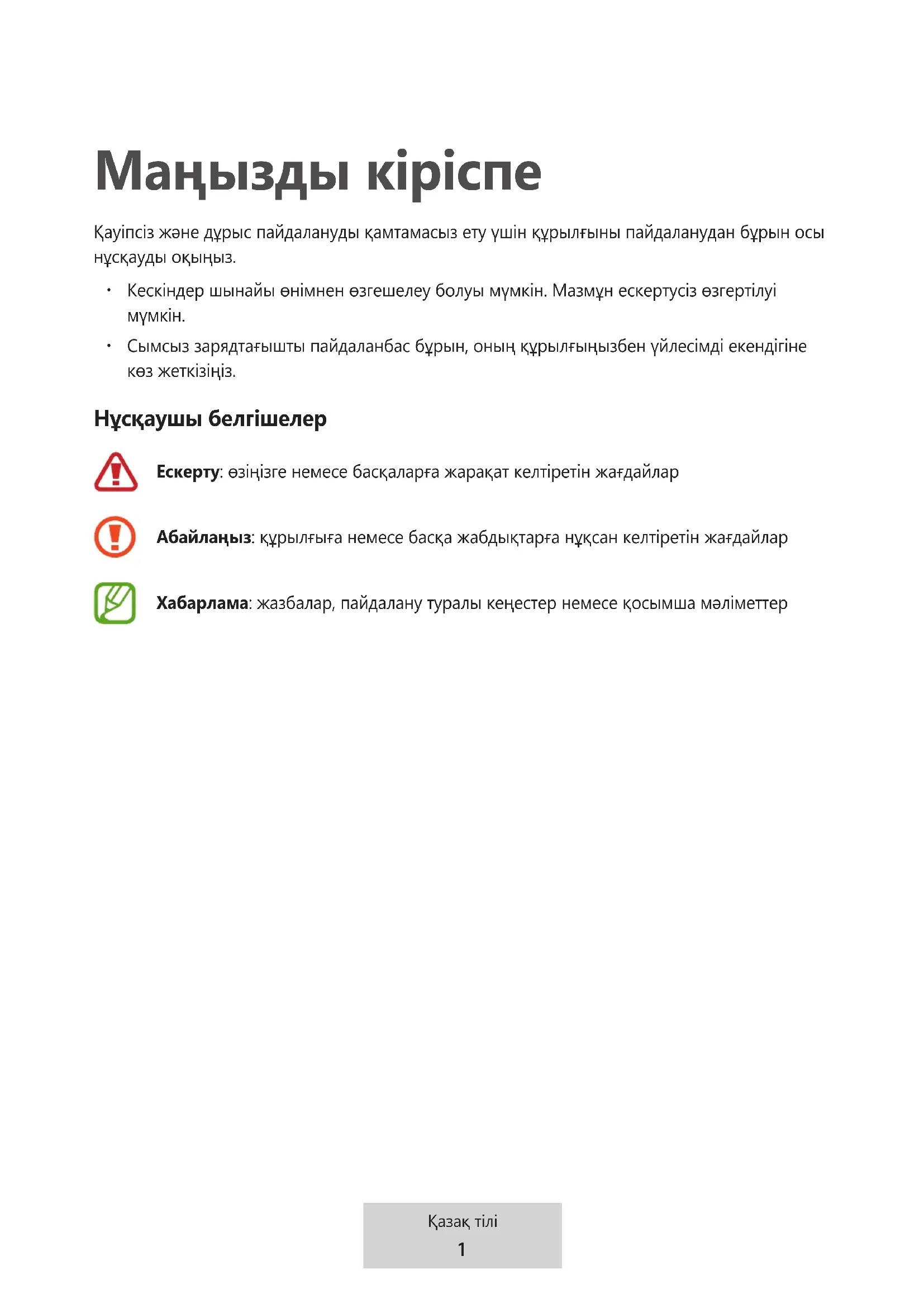 Сымсыз зарядтағышты пайдаланбас бұрын, оның құрылғыңызбен үйлесімді екендігіне көз жеткізіңіз. Нұсқаушы белгішелер Ескерту: өзіңізге немесе басқаларға жарақат келтіретін жағдайлар Абайлаңыз: құрылғыға немесе басқа жабдықтарға нұқсан келтіретін жағдайлар Хабарлама: жазбалар, пайдалану туралы кеңестер немесе қосымша мәліметтер2