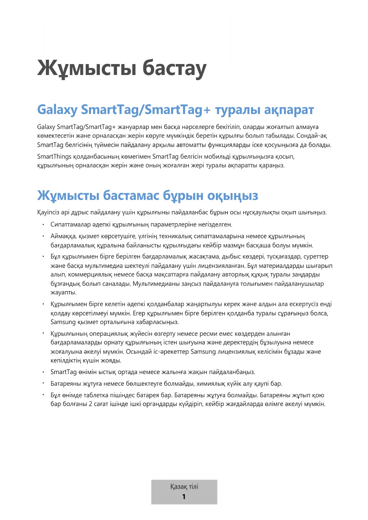 Жұмысты бастау Galaxy SmartTag/SmartTag+ туралы ақпарат Galaxy SmartTag/SmartTag+ жануарлар мен басқа нәрселерге бекітіліп, оларды жоғалтып алмауға көмектесетін және орналасқан жерін көруге мүмкіндік беретін құрылғы болып табылады. Сондай-ақ SmartTag белгісінің түймесін пайдалану арқылы автоматты функцияларды іске қосуыңызға да болады.SmartThings қолданбасының көмегімен SmartTag белгісін мобильді құрылғыңызға қосып, құрылғының орналасқан жерін және оның жоғалған жері туралы ақпаратты қараңыз. Жұмысты бастамас бұрын оқыңыз Қауіпсіз әрі дұрыс пайдалану үшін құрылғыны пайдаланбас бұрын осы нұсқаулықты оқып шығыңыз. Сипаттамалар әдепкі құрылғының параметрлеріне негізделген. Аймаққа, қызмет көрсетушіге, үлгінің техникалық сипаттамаларына немесе құрылғының бағдарламалық құралына байланысты құрылғыдағы кейбір мазмұн басқаша болуы мүмкін. Бұл құрылғымен бірге берілген бағдарламалық жасақтама, дыбыс көздері, түсқағаздар, суреттер және басқа мультимедиа шектеулі пайдалану үшін лицензияланған. Бұл материалдарды шығарып алып, коммерциялық немесе басқа мақсаттарға пайдалану авторлық құқық туралы заңдарды бұзғандық болып саналады. Мультимедианы заңсыз пайдалануға толығымен пайдаланушылар жауапты. Құрылғымен бірге келетін әдепкі қолданбалар жаңартылуы керек және алдын ала ескертусіз енді қолдау көрсетілмеуі мүмкін. Егер құрылғымен бірге берілген қолданба туралы сұрағыңыз болса, Samsung қызмет орталығына хабарласыңыз. Құрылғының операциялық жүйесін өзгерту немесе ресми емес көздерден алынған бағдарламаларды орнату құрылғының істен шығуына және деректердің бұзылуына немесе жоғалуына әкелуі мүмкін. Осындай іс-әрекеттер Samsung лицензиялық келісімін бұзады және кепілдіктің күшін жояды. SmartTag өнімін ыстық ортада немесе жалынға жақын пайдаланбаңыз. Батареяны жұтуға немесе бөлшектеуге болмайды, химиялық күйік алу қаупі бар. Бұл өнімде таблетка пішіндес батарея бар. Батареяны жұтуға болмайды. Батареяны жұтып қою бар болғаны 2 сағат ішінде ішкі органдарды күйдіріп, кейбір жағдайларда өлімге әкелуі мүмкін.
