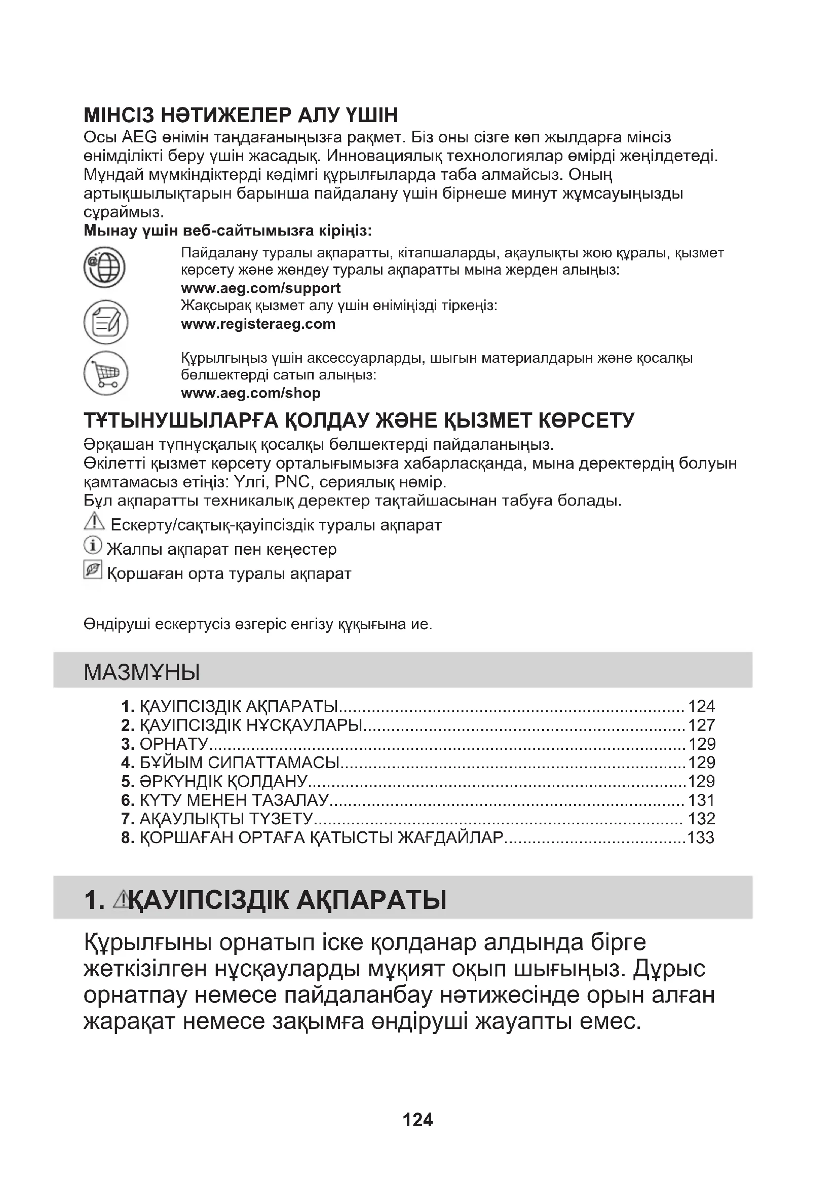 Riciclare i materiali con il simbolo . Buttare l'imballaggio negli appositi contenitori per il riciclaggio. Aiutare a proteggere l’ambiente e la salute umana e a riciclare rifiuti derivanti da apparecchiature elettriche ed elettroniche. Non smaltire le apparecchiature che riportano il simbolo insieme ai normali rifiuti domestici. Portare il prodotto al punto di riciclaggio più vicino o contattare il comune di residenza. 123МІНСІЗ НӘТИЖЕЛЕР АЛУ ҮШІН Осы AEG өнімін таңдағаныңызға рақмет. Біз оны сізге көп жылдарға мінсізөнімділікті беру үшін жасадық. Инновациялық технологиялар өмірді жеңілдетеді.Мұндай мүмкіндіктерді кәдімгі құрылғыларда таба алмайсыз. Оныңартықшылықтарын барынша пайдалану үшін бірнеше минут жұмсауыңыздысұраймыз.Мынау үшін веб-сайтымызға кіріңіз:Пайдалану туралы ақпаратты, кітапшаларды, ақаулықты жою құралы, қызметкөрсету және жөндеу туралы ақпаратты мына жерден алыңыз:www.aeg.com/supportЖақсырақ қызмет алу үшін өніміңізді тіркеңіз:www.registeraeg.comҚұрылғыңыз үшін аксессуарларды, шығын материалдарын және қосалқыбөлшектерді сатып алыңыз:www.aeg.com/shop ТҰТЫНУШЫЛАРҒА ҚОЛДАУ ЖӘНЕ ҚЫЗМЕТ КӨРСЕТУ Әрқашан түпнұсқалық қосалқы бөлшектерді пайдаланыңыз.Өкілетті қызмет көрсету орталығымызға хабарласқанда, мына деректердің болуынқамтамасыз етіңіз: Үлгі, PNC, сериялық нөмір.Бұл ақпаратты техникалық деректер тақтайшасынан табуға болады. Ескерту/сақтық-қауіпсіздік туралы ақпарат Жалпы ақпарат пен кеңестер Қоршаған орта туралы ақпаратӨндіруші ескертусіз өзгеріс енгізу құқығына ие.