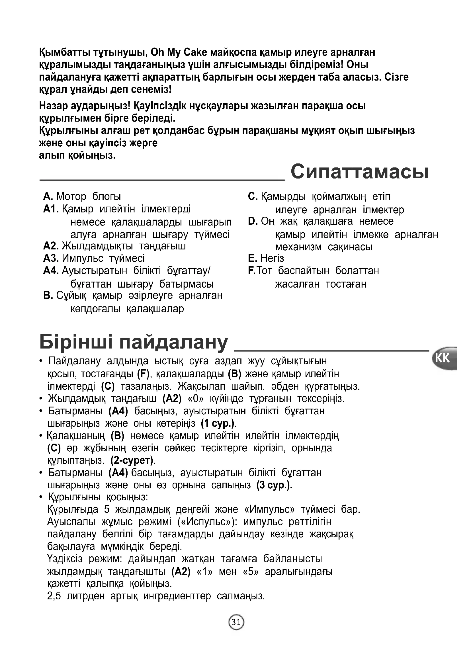 - Құрылғыны қосыңыз: Құрылғыда 5 жылдамдық деңгейі және «Импульс» түймесі бар. Ауыспалы жұмыс режимі («Испульс»): импульс реттілігін пайдалану белгілі бір тағамдарды дайындау кезінде жақсырақ бақылауға мүмкіндік береді. Үздіксіз режим: дайындап жатқан тағамға байланысты жылдамдық таңдағышты (A2) «1» мен «5» аралығындағы қажетті қалыпқа қойыңыз. 2,5 литрден артық ингредиенттер салмаңыз. Сипаттамасы Назар аударыңыз! Қауіпсіздік нұсқаулары жазылған парақша осы құрылғымен бірге беріледі. Құрылғыны алғаш рет қолданбас бұрын парақшаны мұқият оқып шығыңыз және оны қауіпсіз жерге алып қойыңыз. Қымбатты тұтынушы, Oh My Cake майқоспа қамыр илеуге арналған құралымызды таңдағаныңыз үшін алғысымызды білдіреміз! Оны пайдалануға қажетті ақпараттың барлығын осы жерден таба аласыз. Сізге құрал ұнайды деп сенеміз! A. Мотор блогы A1. Қамыр илейтін ілмектерді немесе қалақшаларды шығарып алуға арналған шығару түймесі A2. Жылдамдықты таңдағыш A3. Импульс түймесі A4. Ауыстыратын білікті бұғаттау/ бұғаттан шығару батырмасы B. Сұйық қамыр әзірлеуге арналған көпдоғалы қалақшалар C. Қамырды қоймалжың етіп илеуге арналған ілмектер D. Оң жақ қалақшаға немесе қамыр илейтін ілмекке арналған механизм сақинасы E. Негіз F. Тот баспайтын болаттан жасалған тостаған KK32