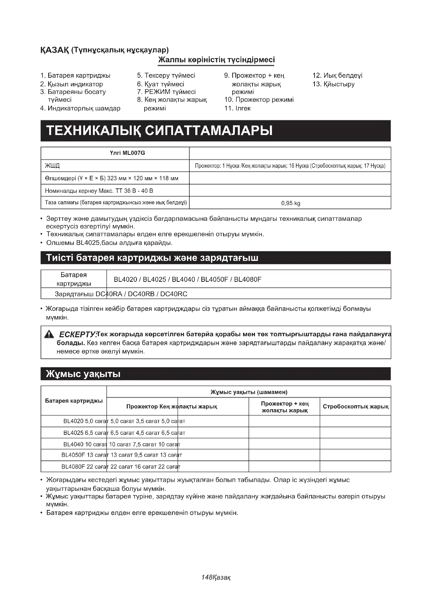 Тек жоғарыда көрсетілген батерйа қорабы мен төк толтырғыштарды ғана пайдалануға болады. Кез келген басқа батарея картридждарын және зарядтағыштарды пайдалану жарақатқа және/ немесе өртке әкелуі мүмкін. Жұмыс уақыты Батарея картриджыЖұмыс уақыты (шамамен)Прожектор Кең жолақты жарықПрожектор + кең жолақты жарықСтробоскоптық жарықBL4020 5,0 сағат 5,0 сағат 3,5 сағат 5,0 сағатBL4025 6,5 сағат 6,5 сағат 4,5 сағат 6,5 сағатBL4040 10 сағат 10 сағат 7,5 сағат 10 сағатBL4050F 13 сағат 13 сағат 9,5 сағат 13 сағатBL4080F 22 сағат 22 сағат 16 сағат 22 сағат