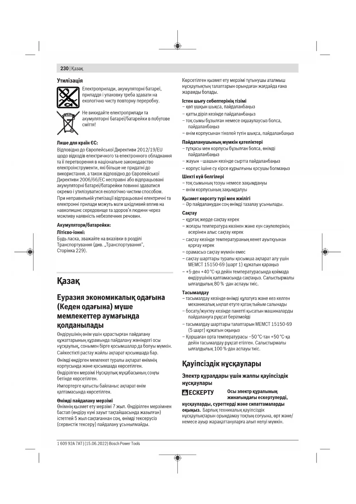 Осы электр құралының жинағындағы ескертулерді, нұсқауларды, суреттерді және сипаттамаларды оқыңыз. Барлық техникалық қауіпсіздік нұсқаулықтарын орындамау тоқтың соғуына, өрт және/ немесе ауыр жарақаттануларға алып келуі мүмкін. 1 609 92A 7AT | (15.06.2022) Bosch Power ToolsҚазақ | 231 Болашақ жұмыстар үшін қауіпсіздік нұсқаулықтары мен ескертпелерді сақтап қойыңыз. Қауіпсіздік нұсқаулықтарында пайдаланылған Электр құрал атауының желіден қуат алатын электр құралдарына (желілік кабелі менен) және аккумуляторден қуат алатын электр құралдарына (желілік кабелі жоқ) қатысы бар. Жұмыс орнының қауіпсіздігі u Жұмыс орнын таза және жарық ұстаңыз. Ластанған және қараңғы жайларда сәтсіз оқиғалар болуы мүмкін. u Электр құрылғысын жарылатын атмосферада пайдаланбаңыз, мысалы, жанатын сұйықтық, газ немесе шаң бар болғанда. Электр құрал ұшқындарды жасайды, ал олар шаң немесе буларды жандыруы