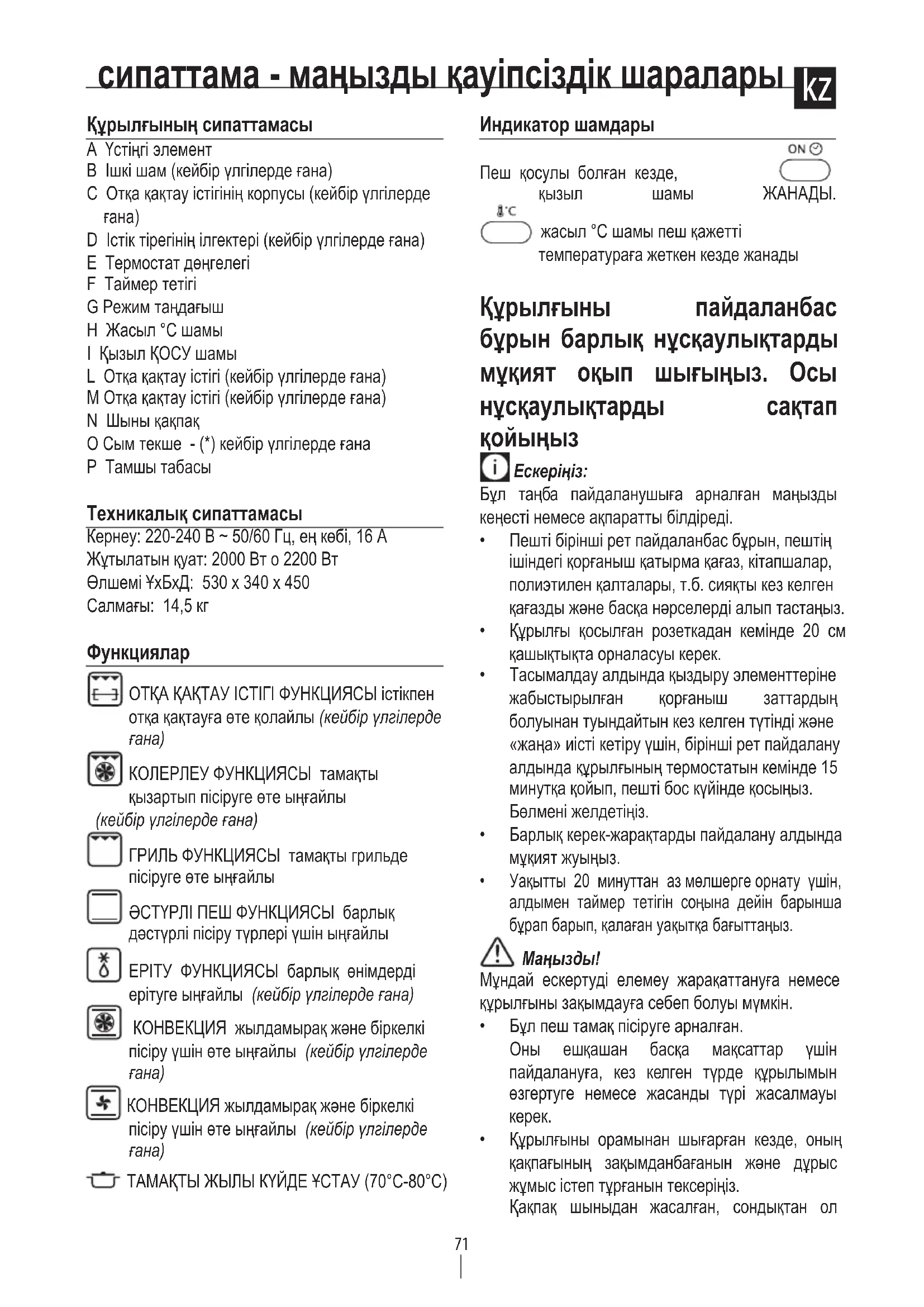 D Істік тірегінің ілгектері (кейбір үлгілерде ғана) E Термостат дөңгелегі F Таймер тетігі G Режим таңдағыш H Жасыл °C шамы I Қызыл ҚОСУ шамы L Отқа қақтау істігі (кейбір үлгілерде ғана) M Отқа қақтау істігі (кейбір үлгілерде ғана) N Шыны қақпақ O Сым текше - (*) кейбір үлгілерде ғана P Тамшы табасы Техникалық сипаттамасы Кернеу: 220-240 В ~ 50/60 Гц, ең көбі, 16 А Жұтылатын қуат: 2000 Вт o 2200 Вт Өлшемі ҰхБхД: 530 x 340 x 450 Салмағы: 14,5 кг