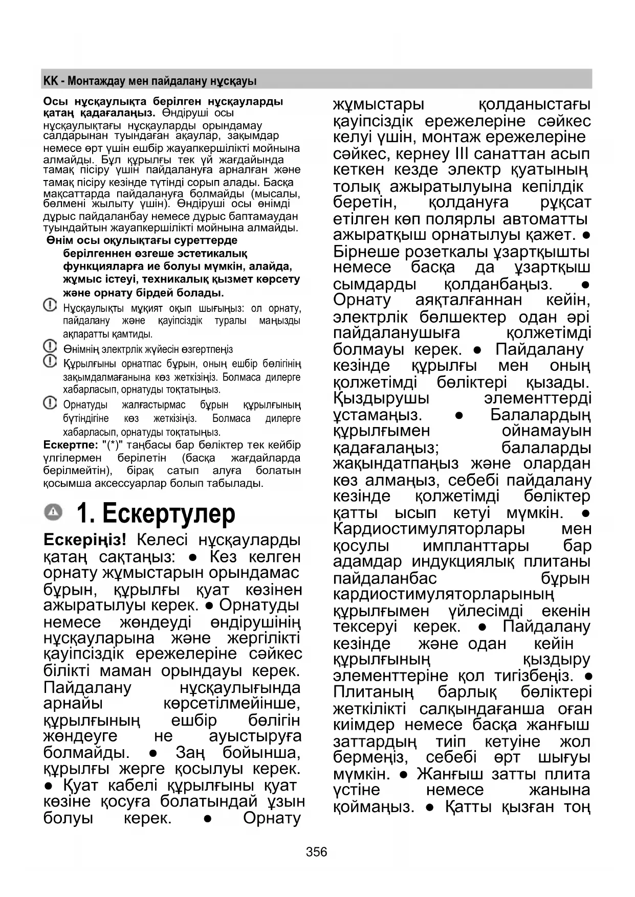 Ескеріңіз! Келесі нұсқауларды қатаң сақтаңыз: ● Кез келген орнату жұмыстарын орындамас бұрын, құрылғы қуат көзінен ажыратылуы керек. ● Орнатуды немесе жөндеуді өндірушінің нұсқауларына және жергілікті қауіпсіздік ережелеріне сәйкес білікті маман орындауы керек. Пайдалану нұсқаулығында арнайы көрсетілмейінше, құрылғының ешбір бөлігін жөндеуге не ауыстыруға болмайды. ● Заң бойынша, құрылғы жерге қосылуы керек. ● Қуат кабелі құрылғыны қуат көзіне қосуға болатындай ұзын болуы керек. ● Орнату жұмыстары қолданыстағы қауіпсіздік ережелеріне сәйкес келуі үшін, монтаж ережелеріне сәйкес, кернеу III санаттан асып кеткен кезде электр қуатының толық ажыратылуына кепілдік беретін, қолдануға рұқсат етілген көп полярлы автоматты ажыратқыш орнатылуы қажет. ● Бірнеше розеткалы ұзартқышты немесе басқа да ұзартқыш сымдарды қолданбаңыз. ● Орнату аяқталғаннан кейін, электрлік бөлшектер одан әрі пайдаланушыға қолжетімді болмауы керек. ● Пайдалану кезінде құрылғы мен оның қолжетімді бөліктері қызады. Қыздырушы элементтерді ұстамаңыз. ● Балалардың құрылғымен ойнамауын қадағалаңыз; балаларды жақындатпаңыз және олардан көз алмаңыз, себебі пайдалану кезінде қолжетімді бөліктер қатты ысып кетуі мүмкін. ● Кардиостимуляторлары мен қосулы импланттары бар адамдар индукциялық плитаны пайдаланбас бұрын кардиостимуляторларының құрылғымен үйлесімді екенін тексеруі керек. ● Пайдалану кезінде және одан кейін құрылғының қыздыру элементтеріне қол тигізбеңіз. ● Плитаның барлық бөліктері жеткілікті салқындағанша оған киімдер немесе басқа жанғыш заттардың тиіп кетуіне жол бермеңіз, себебі өрт шығуы мүмкін. ● Жанғыш затты плита үстіне немесе жанына қоймаңыз. ● Қатты қызған тоң357 майлар мен сұйық майлар тез жанғыш болады. Майлы тағамдарды дайындау кезінде сақ болыңыз. ● Егер плита бетінде жарықтар пайда болса, ток соғу қаупін болдырмас үшін құрылғыны дереу өшіріңіз. ● Құрылғы сыртқы таймермен не бөлек қашықтан басқару құралымен жұмыс істемейді. ● Плитада майды ұқыпсыз пайдалану қауіпті болуы мүмкін және өрт тудыруы ықтимал. ● Тамақ пісіру процесін қадағалап тұру қажет. Қысқа пісіру процесі үнемі бақылануы қажет. ● Өртті ЕШҚАШАН сумен өшіру әрекетін жасауға болмайды. Оның орнына құрылғыны өшіріп, өртті қақпақ не шүберек клеенка сияқты нәрсемен жабыңыз. Өрт қаупі бар: плита бетіне бөгде заттарды қоймаңыз. ● Бу тазартқыштарды пайдаланбаңыз, ток соғу қаупі бар. ● Пышақтар, шанышқылар, қасықтар немесе қақпақтар сияқты металл заттарды пешке қоймаңыз, себебі олар қызып кетуі мүмкін. ● Құрылғыны электр желісіне қоспас бұрын: кернеу мен қуаттың электр желісіне сәйкес келетіндігіне және розеткаға сәйкес келетіндігіне көз жеткізу үшін мәліметтер тақтасын (құрылғының төменгі жағында) тексеріңіз. Күмәніңіз болса, білікті электр маманымен