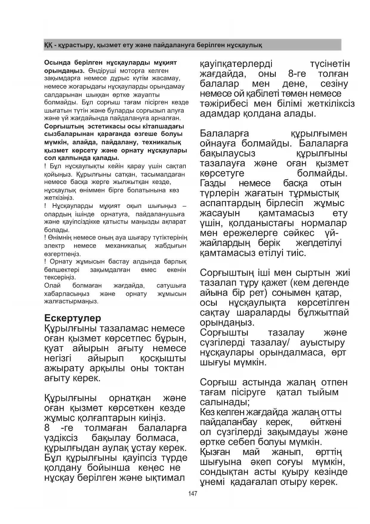 Құрылғыны тазаламас немесе оған қызмет көрсетпес бұрын, қуат айырын ағыту немесе негізгі айырып қосқышты ажырату арқылы оны токтан ағыту керек. Құрылғыны орнатқан жəне оған қызмет көрсеткен кезде жұмыс қолғаптарын киіңіз. 8 -ге толмаған балаларға үздіксіз бақылау болмаса, құрылғыдан аулақ ұстау керек. Бұл құрылғыны қауіпсіз түрде қолдану бойынша кеңес не нұсқау берілген жəне ықтимал қауіпқатерлерді түсінетін жағдайда, оны 8-ге толған балалар мен дене, сезіну немесе ой қабілеті төмен немесе тəжірибесі мен білімі жеткіліксіз адамдар қолдана алады. Балаларға құрылғымен ойнауға болмайды. Балаларға бақылаусыз құрылғыны тазалауға жəне оған қызмет көрсетуге болмайды. Газды немесе басқа отын түрлерін жағатын тұрмыстық аспаптардың бірлесіп жұмыс жасауын қамтамасыз ету үшін, қолданыстағы нормалар мен ережелерге сəйкес үй- жайлардың берік желдетілуі қамтамасыз етілуі тиіс. Сорғыштың іші мен сыртын жиі тазалап тұру қажет (кем дегенде айына бір рет) сонымен қатар, осы нұсқаулықта көрсетілген сақтау шараларды бұлжытпай
