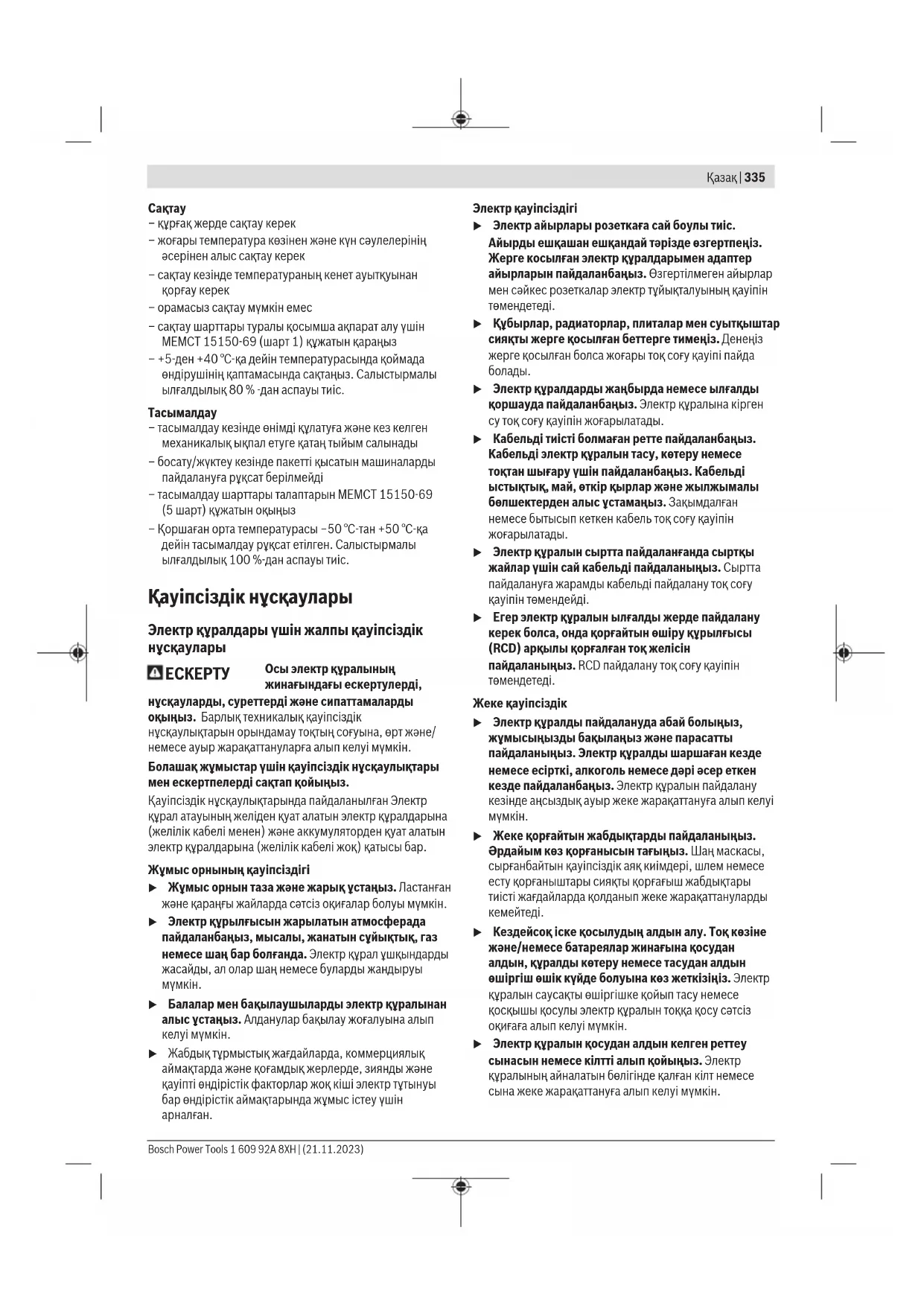 u Кездейсоқ іске қосылудың алдын алу. Тоқ көзіне және/немесе батареялар жинағына қосудан алдын, құралды көтеру немесе тасудан алдын өшіргіш өшік күйде болуына көз жеткізіңіз. Электр құралын саусақты өшіргішке қойып тасу немесе қосқышы қосулы электр құралын тоққа қосу сәтсіз оқиғаға алып келуі мүмкін. u Электр құралын қосудан алдын келген реттеу сынасын немесе кілтті алып қойыңыз. Электр құралының айналатын бөлігінде қалған кілт немесе сына жеке жарақаттануға алып келуі мүмкін. Bosch Power Tools 1 609 92A 8XH | (21.11.2023)336 | Қазақ u Көп күш істетпеңіз. Әрдайым тиісті таяныш пен тең салмақытылқты сақтаңыз. Бұл күтілмеген жағдайларда электр құралдың бақылануын сақтайды. u Тиісті киім киіңіз. Бос киім мен әшекейлерді киймеңіз. Шашыңыз бен киімдерді жылжымалы бөлшектерден алыс ұстаңыз. Бос киімдер, әшекейлер немесе ұзын шаш жылжымалы бөлшектер арқылы тартылуы мүмкін. u Егер шаң шығарып жинау жабдықтарына қосу құрылғылары берліген болса, онда олар қосулы болуына және тиісті ретте қолдануына көз жеткізіңіз. Шаң жинауды пайдалану шаңға байланысты зияндарды кемейтеді. u Аспаптарды жиі пайдаланып жақсы білгеннен соң масайрап кетпей қауіпсіздік принциптерін елемей отырмаңыз. Абайсыз әрекет секунд ішінде ауыр жарақаттануға алып келуі мүмкін. u НАЗАР АУДАРЫҢЫЗ! Энергиямен жабдықтаудың толықтай не жекелей тоқтатылуы немесе энергиямен жабдықтауды басқару тізбегінің ақаулануы салдарынан электр құралының жұмысында кідіріс пайда болған жағдайда, бұғатталмағандығына көз жеткізіп (болған жағдайда) барып, ажыратқышты Выкл. (Өшіру) қалпына келтіріңіз. Желілік ашаны розеткадан шығарыңыз немесе алып – салмалы аккумуляторды ажыратыңыз. Осы әрекет арқылы бақыланбайтын қайта іске қосылудың алдын аласыз. u Аталмыш пайдалану жөніндегі нұсқаулыққа сәйкес білікті қызметкерлер құрамына электр құралын реттеу, монтаждау, қолданысқа енгізу және оған қызмет көрсету әрекеттерімен таныс тұлғалар жатады. u Электр құралымен жұмыс істеуге 18 жасқа толған, техникалық сипаттаманы, пайдалану жөніндегі нұсқаулықты және қауіпсіздік ережелерін оқып шыққан тұлғаларға рұқсат етіледі. u Дене, сезім немесе ақыл-ой қабілеттері шектеулі немесе тәжірибесі мен білімі жеткіліксіз адамдар олардың қауіпсіздігі үшін жауапты тұлғаның бақылауында болмаса немесе электр құралын пайдалану бойынша нұсқау алмаған болса, бұйымды пайдаланбауы тиіс. Электр құралдарын пайдалану және күту u Құралды аса көп жүктемеңіз. Жұмысыңыз үшін жарамды электр құралын пайдаланыңыз. Жарамды электр құралымен керекті жұмыс аймағында дұрыс әрі сенімді жұмыс істейсіз. u Ажыратқышы дұрыс емес электр құралын пайдаланбаңыз. Қосуға немесе өшіруге болмайтын электр құралы қауіпті болып, оны жөндеу қажет