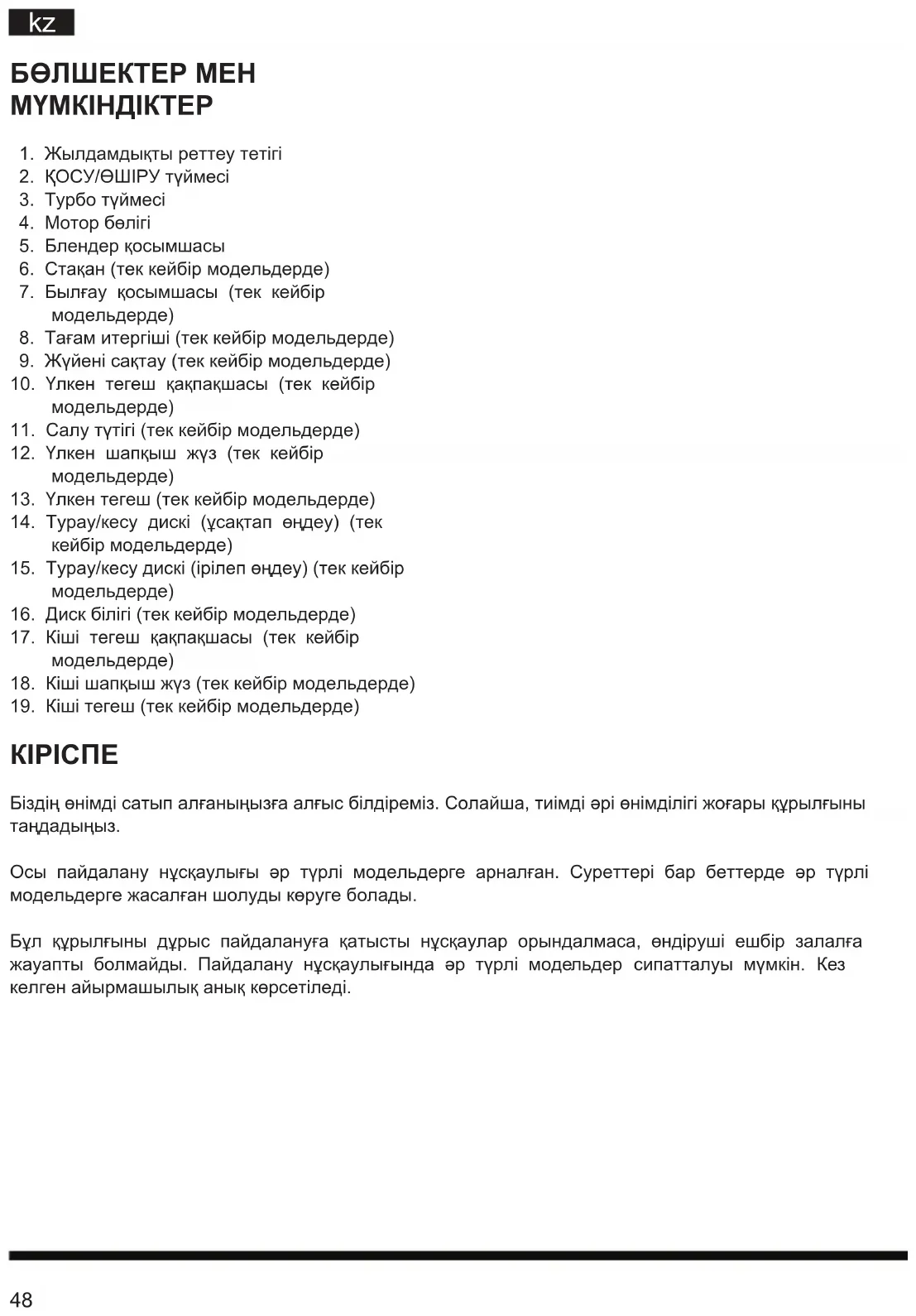 Біздің өнімді сатып алғаныңызға алғыс білдіреміз. Солайша, тиімді әрі өнімділігі жоғары құрылғыны таңдадыңыз. Осы пайдалану нұсқаулығы әр түрлі модельдерге арналған. Суреттері бар беттерде әр түрлі модельдерге жасалған шолуды көруге болады. Бұл құрылғыны дұрыс пайдалануға қатысты нұсқаулар орындалмаса, өндіруші ешбір залалға жауапты болмайды. Пайдалану нұсқаулығында әр түрлі модельдер сипатталуы мүмкін. Кез келген айырмашылық анық көрсетіледі.49