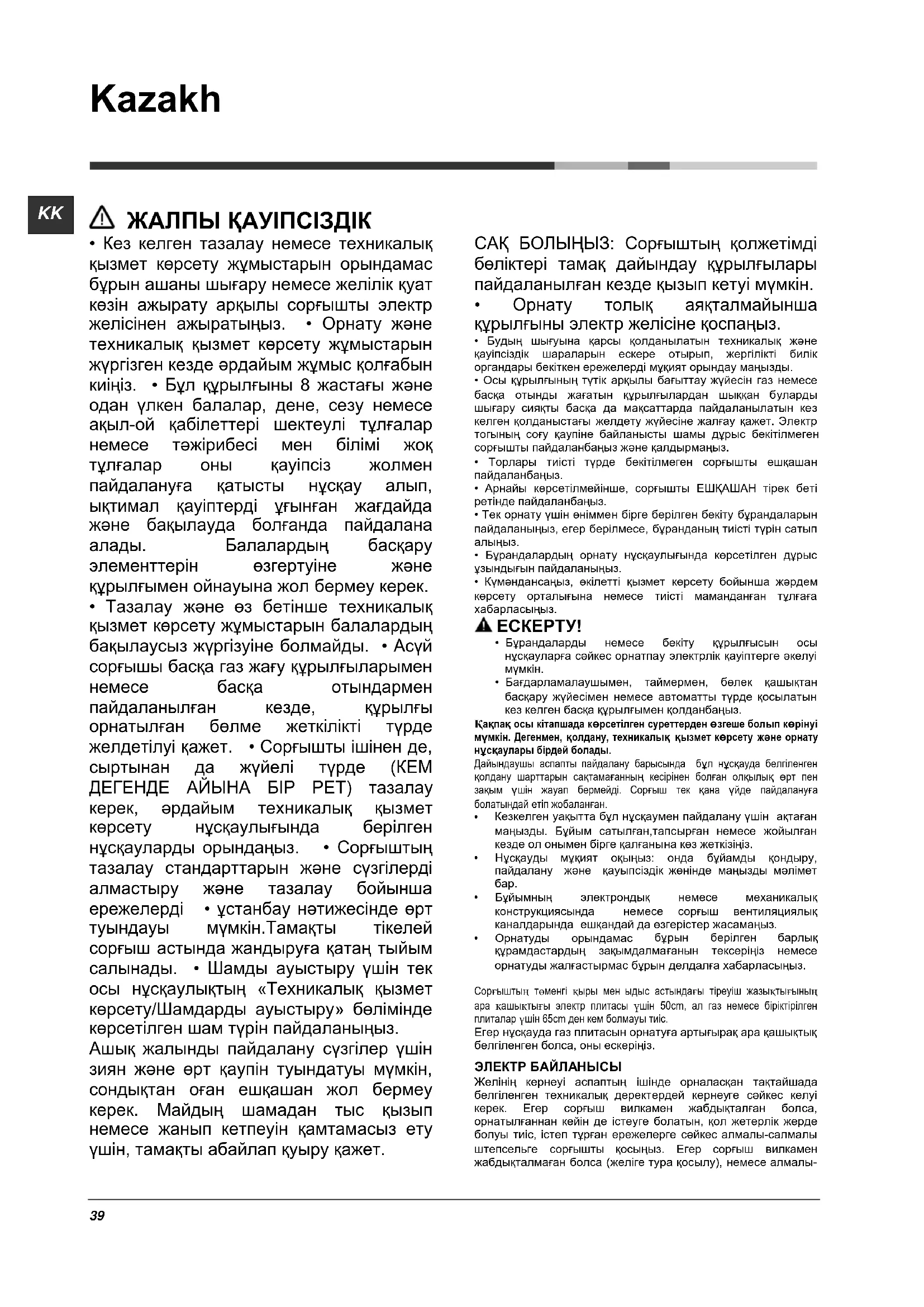 - Тазалау жəне өз бетінше техникалық қызмет көрсету жұмыстарын балалардың бақылаусыз жүргізуіне болмайды. • Асүй сорғышы басқа газ жағу құрылғыларымен немесе басқа отындармен пайдаланылған кезде, құрылғы орнатылған бөлме жеткілікті түрде желдетілуі қажет. • Сорғышты ішінен де, сыртынан да жүйелі түрде (КЕМ ДЕГЕНДЕ АЙЫНА БІР РЕТ) тазалау керек, əрдайым техникалық қызмет көрсету нұсқаулығында берілген нұсқауларды орындаңыз. • Сорғыштың тазалау стандарттарын жəне сүзгілерді алмастыру жəне тазалау бойынша ережелерді • ұстанбау нəтижесінде өрт туындауы мүмкін.Тамақты тікелей сорғыш астында жандыруға қатаң тыйым салынады. • Шамды ауыстыру үшін тек осы нұсқаулықтың «Техникалық қызмет көрсету/Шамдарды ауыстыру» бөлімінде көрсетілген шам түрін пайдаланыңыз. Ашық жалынды пайдалану сүзгілер үшін зиян жəне өрт қаупін туындатуы мүмкін, сондықтан оған ешқашан жол бермеу керек. Майдың шамадан тыс қызып немесе жанып кетпеуін қамтамасыз ету үшін, тамақты абайлап қуыру қажет. САҚ БОЛЫҢЫЗ: Сорғыштың қолжетімді бөліктері тамақ дайындау құрылғылары пайдаланылған кезде қызып кетуі мүмкін.