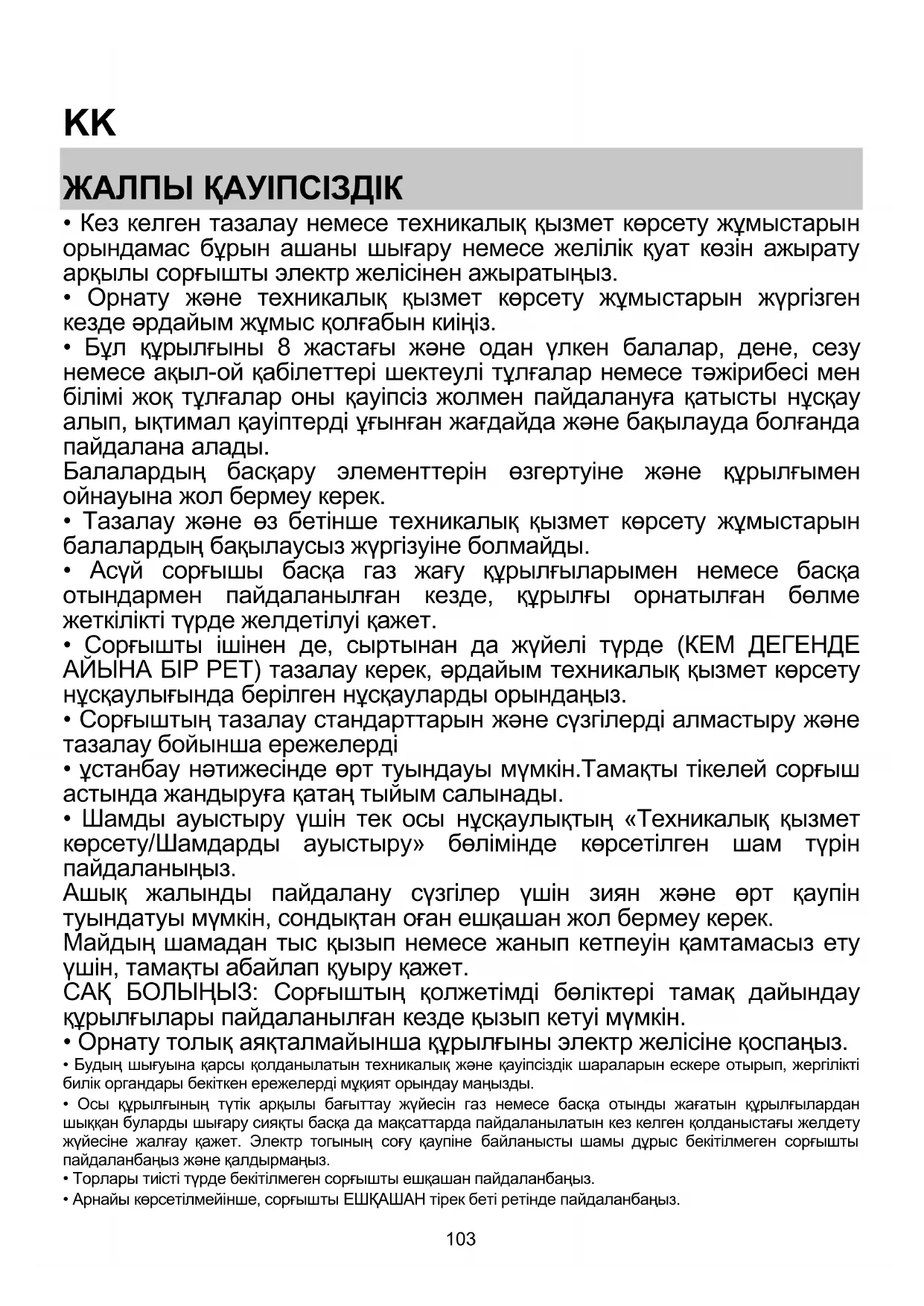 - Бұл құрылғыны 8 жастағы жəне одан үлкен балалар, дене, сезу немесе ақыл-ой қабілеттері шектеулі тұлғалар немесе тəжірибесі мен білімі жоқ тұлғалар оны қауіпсіз жолмен пайдалануға қатысты нұсқау алып, ықтимал қауіптерді ұғынған жағдайда жəне бақылауда болғанда пайдалана алады. Балалардың басқару элементтерін өзгертуіне жəне құрылғымен ойнауына жол бермеу керек.