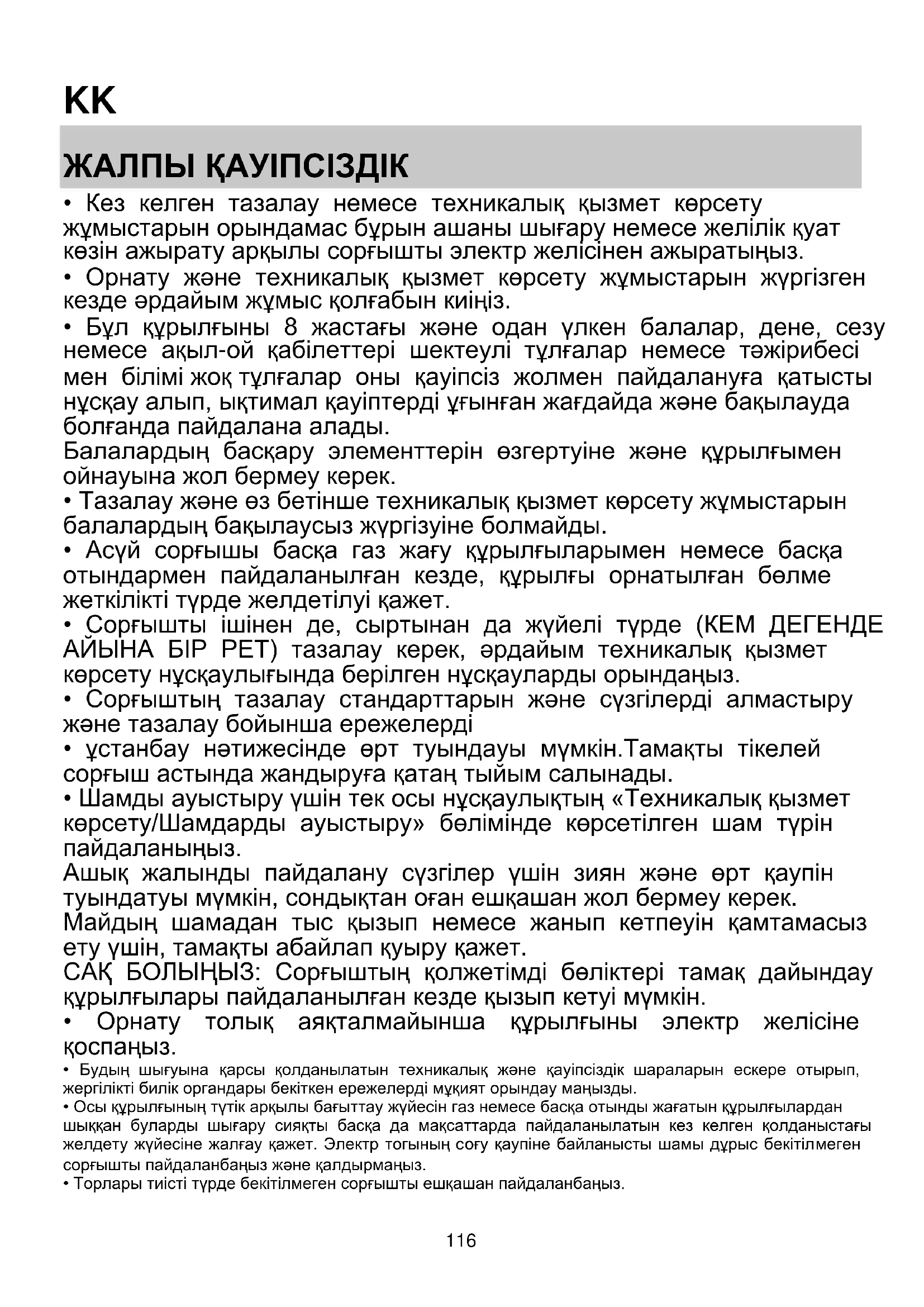 - Бұл құрылғыны 8 жастағы және одан үлкен балалар, дене, сезу немесе ақыл-ой қабілеттері шектеулі тұлғалар немесе тәжірибесі мен білімі жоқ тұлғалар оны қауіпсіз жолмен пайдалануға қатысты нұсқау алып, ықтимал қауіптерді ұғынған жағдайда және бақылауда болғанда пайдалана алады. Балалардың басқару элементтерін өзгертуіне және құрылғымен ойнауына жол бермеу керек.
