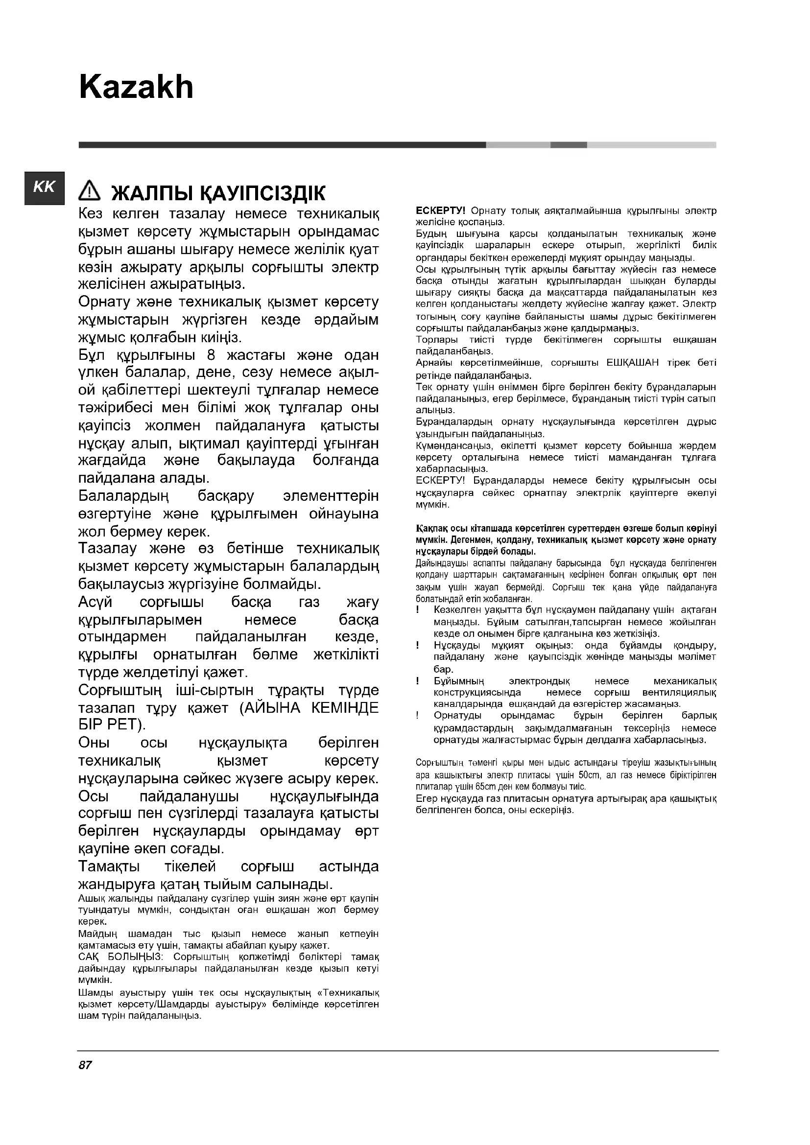 ЖАЛПЫ ҚАУІПСІЗДІК Кез келген тазалау немесе техникалық қызмет көрсету жұмыстарын орындамас бұрын ашаны шығару немесе желілік қуат көзін ажырату арқылы сорғышты электр желісінен ажыратыңыз. Орнату жəне техникалық қызмет көрсету жұмыстарын жүргізген кезде əрдайым жұмыс қолғабын киіңіз. Бұл құрылғыны 8 жастағы жəне одан үлкен балалар, дене, сезу немесе ақыл- ой қабілеттері шектеулі тұлғалар немесе тəжірибесі мен білімі жоқ тұлғалар оны қауіпсіз жолмен пайдалануға қатысты нұсқау алып, ықтимал қауіптерді ұғынған жағдайда жəне бақылауда болғанда пайдалана алады. Балалардың басқару элементтерін өзгертуіне жəне құрылғымен ойнауына жол бермеу керек. Тазалау жəне өз бетінше техникалық қызмет көрсету жұмыстарын балалардың бақылаусыз жүргізуіне болмайды. Асүй сорғышы басқа газ жағу құрылғыларымен немесе басқа отындармен пайдаланылған кезде, құрылғы орнатылған бөлме жеткілікті түрде желдетілуі қажет. Сорғыштың іші-сыртын тұрақты түрде тазалап тұру қажет (АЙЫНА КЕМІНДЕ