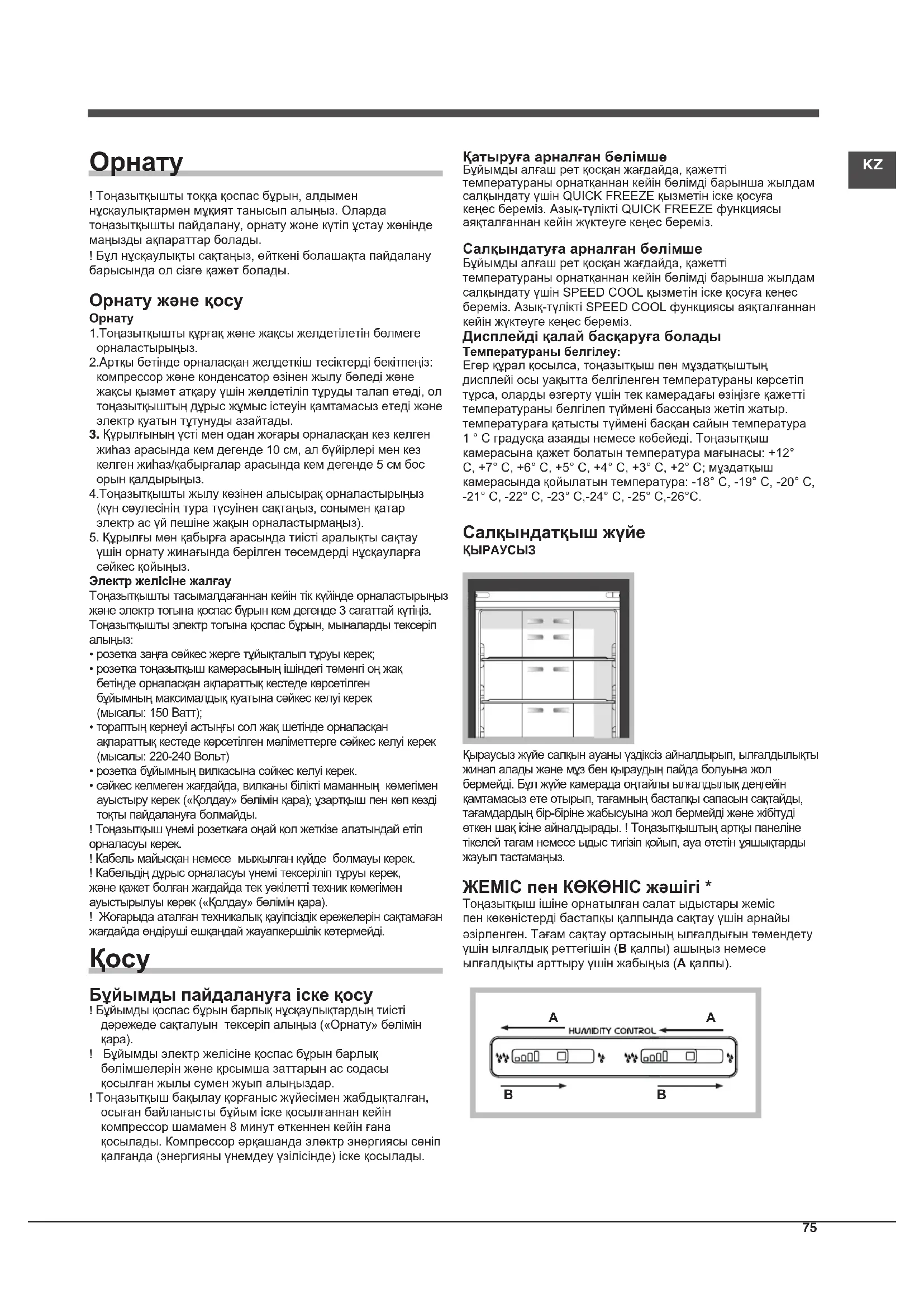 ! Тоңазытқышты тоққа қоспас бұрын, алдымен нұсқаулықтармен мұқият танысып алыңыз. Оларда тоңазытқышты пайдалану, орнату және күтіп ұстау жөнінде маңызды ақпараттар болады.! Бұл нұсқаулықты сақтаңыз, өйткені болашақта пайдалану барысында ол сізге қажет болады. Орнату және қосу Орнату1.Тоңазытқышты құрғақ және жақсы желдетілетін бөлмеге орналастырыңыз. 2.Артқы бетінде орналасқан желдеткіш тесіктерді бекітпеңіз: компрессор және конденсатор өзінен жылу бөледі және жақсы қызмет атқару үшін желдетіліп тұруды талап етеді, ол тоңазытқыштың дұрыс жұмыс істеуін қамтамасыз етеді және электр қуатын тұтунуды азайтады. 3. Құрылғының үсті мен одан жоғары орналасқан кез келген жиһаз арасында кем дегенде 10 см, ал бүйірлері мен кез келген жиһаз/қабырғалар арасында кем дегенде 5 см бос орын қалдырыңыз.4.Тоңазытқышты жылу көзінен алысырақ орналастырыңыз (күн сәулесінің тура түсуінен сақтаңыз, сонымен қатар электр ас үй пешіне жақын орналастырмаңыз). 5. Құрылғы мен қабырға арасында тиісті аралықты сақтау үшін орнату жинағында берілген төсемдерді нұсқауларға сәйкес қойыңыз.Электр желісіне жалғауТоңазытқышты тасымалдағаннан кейін тік күйінде орналастырыңыз және электр тогына қоспас бұрын кем дегенде 3 сағаттай күтіңіз. Тоңазытқышты электр тогына қоспас бұрын, мыналарды тексеріп алыңыз:• розетка заңға сәйкес жерге тұйықталып тұруы керек;• розетка тоңазытқыш камерасының ішіндегі төменгі оң жақ бетінде орналасқан ақпараттық кестеде көрсетілгенбұйымның максималдық қуатына сәйкес келуі керек (мысалы: 150 Ватт);• тораптың кернеуі астыңғы сол жақ шетінде орналасқан ақпараттық кестеде көрсетілген мәліметтерге сәйкес келуі керек (мысалы: 220-240 Вольт) • розетка бұйымның вилкасына сәйкес келуі керек. • сәйкес келмеген жағдайда, вилканы білікті маманның көмегімен ауыстыру керек («Қолдау» бөлімін қара); ұзартқыш пен көп көзді тоқты пайдалануға болмайды. ! Тоңазытқыш үнемі розеткаға оңай қол жеткізе алатындай етіп орналасуы керек. ! Кабель майысқан немесе мыжылған күйде болмауы керек.! Кабельдің дұрыс орналасуы үнемі тексеріліп тұруы керек, және қажет болған жағдайда тек уәкілетті техник көмегімен ауыстырылуы керек («Қолдау» бөлімін қара).! Жоғарыда аталған техникалық қауіпсіздік ережелерін сақтамаған жағдайда өндіруші ешқандай жауапкершілік көтермейді.