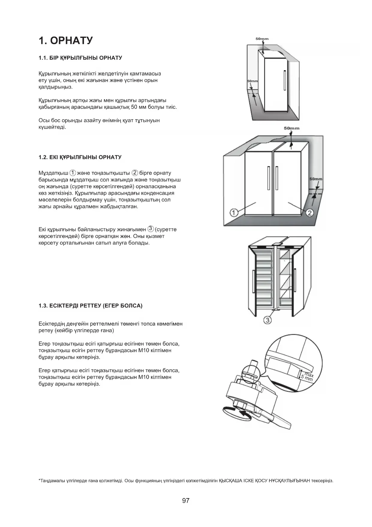 1.1. БІР ҚҰРЫЛҒЫНЫ ОРНАТУ Құрылғыныңжеткіліктіжелдетілуінқамтамасыз етуүшін,оныңекіжағынанжәнеүстіненорын қалдырыңыз. Құрылғыныңартқыжағыменқұрылғыартындағы қабырғаныңарасындағықашықтық50ммболуытиіс. Осыбосорындыазайтуөнімніңқуаттұтынуын