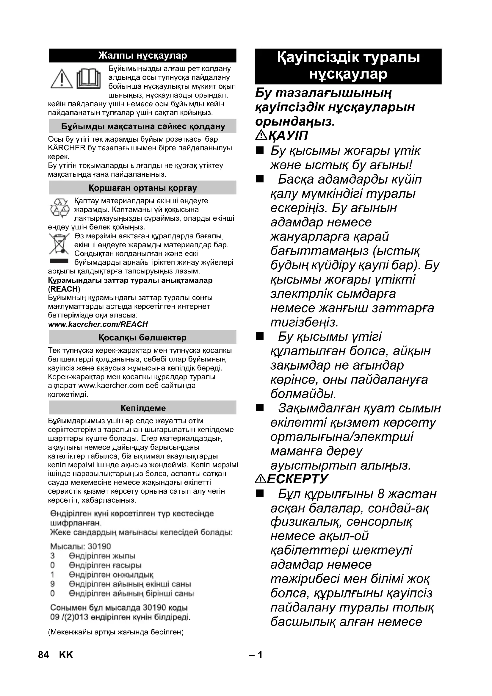 Бу үтігін тоқымаларды ылғалды не құрғақ үтіктеу мақсатында ғана пайдаланыңыз. Қаптау материалдары екінші өңдеуге жарамды. Қаптаманы үй қоқысына лақтырмауыңызды сұраймыз, оларды екінші өңдеу үшін бөлек қойыңыз. Өз мерзімін аяқтаған құралдарда бағалы, екінші өңдеуге жарамды материалдар бар. Сондықтан қолданылған жəне ескі бұйымдарды арнайы іріктеп жинау жүйелері арқылы қалдықтарға тапсыруыңыз лазым. Құрамындағы заттар туралы анықтамалар (REACH) Бұйымның құрамындағы заттар туралы соңғы мағлұматтарды астыда көрсетілген интернет беттерімізде оқи аласыз: www.kaercher.com/REACH Тек түпнұсқа керек-жарақтар мен түпнұсқа қосалқы бөлшектерді қолданыңыз, себебі олар бұйымның қауіпсіз жəне ақаусыз жұмысына кепілдік береді. Керек-жарақтар мен қосалқы құралдар туралы ақпарат www.kaercher.com веб-сайтында қолжетімді. Бұйымдарымыз үшін əр елде жауапты өтім серіктестеріміз тарапынан шығарылатын кепілдеме шарттары күште болады. Егер материалдардың ақаулығы немесе дайындау барысындағы қателіктер табылса, біз ықтимал ақаулықтарды кепіл мерзімі ішінде ақысыз жөндейміз. Кепіл мерзімі ішінде наразылықтарыңыз болса, аспапты сатқан сауда мекемесіне немесе жақындағы өкілетті сервистік қызмет көрсету орнына сатып алу чегін көрсетіп, хабарласыңыз. (Мекенжайы артқы жағында берілген) Бу тазалағышының қауіпсіздік нұсқауларын