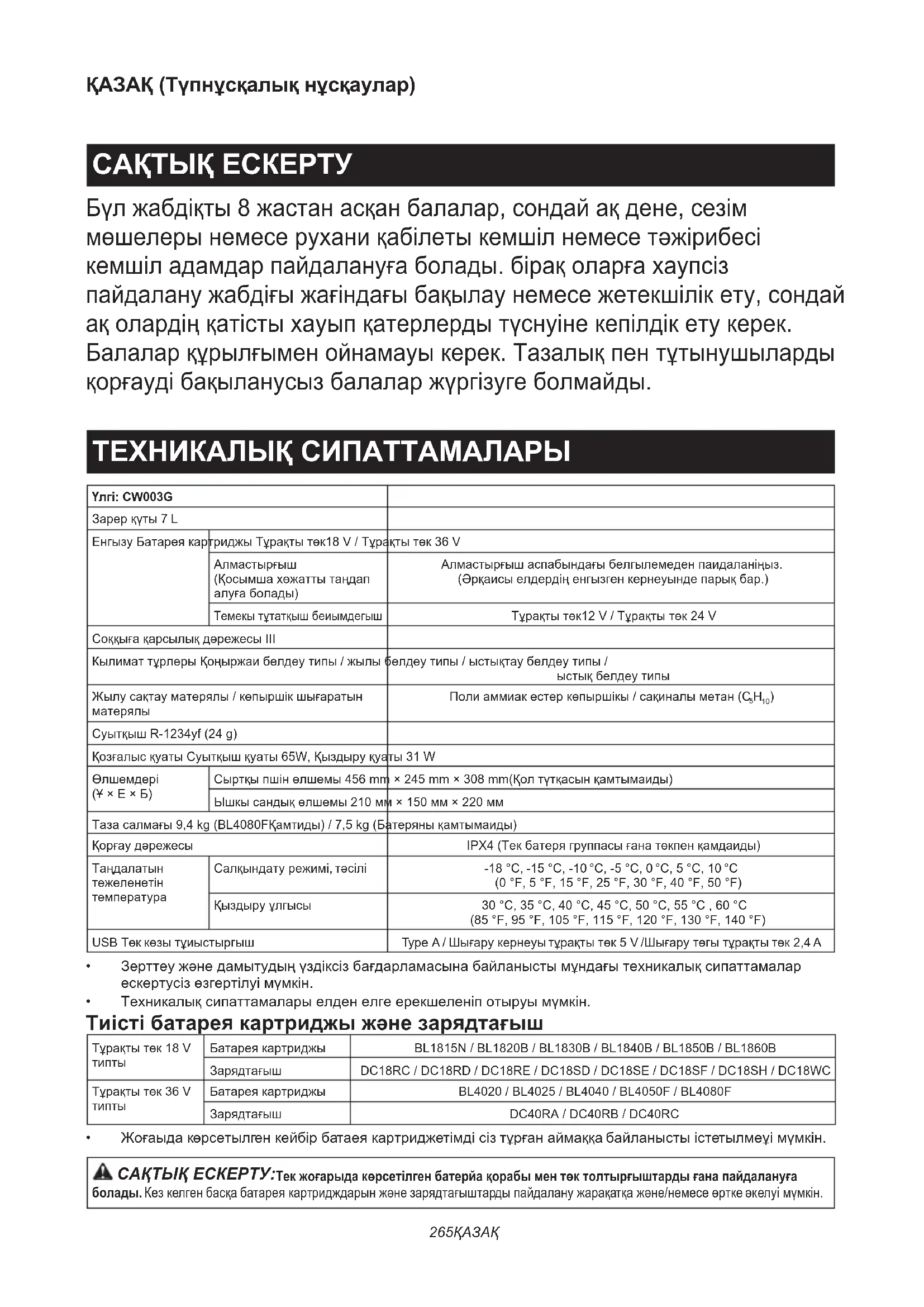 - Оригинальная батарея и зарядное устройство Makita ПРИМЕЧАНИЕ: Некоторые элементы из списка могут быть включены в пакет в качестве стандарт- ных аксессуаров. Комплект поставки может отли- чаться в разных странах.265 ҚАЗАҚ ҚАЗАҚ (Түпнұсқалық нұсқаулар) САҚТЫҚ ЕСКЕРТУ Бүл жабдіқты 8 жастан асқан балалар, сондай ақ дене, сезім мөшелеры немесе рухани қабілеты кемшіл немесе тәжірибесі кемшіл адамдар пайдалануға болады. бірақ оларға хаупсіз пайдалану жабдіғы жағіндағы бақылау немесе жетекшілік ету, сондай ақ олардің қатісты хауып қатерлерды түснуіне кепілдік ету керек. Балалар құрылғымен ойнамауы керек. Тазалық пен тұтынушыларды қорғауді бақыланусыз балалар жүргізуге болмайды. ТЕХНИКАЛЫҚ СИПАТТАМАЛАРЫ Үлгі: CW003GЗарер қүты 7 LЕнгызу Батарея картриджы Тұрақты төк18 V / Тұрақты төк 36 VАлмастырғыш (Қосымша хөжатты таңдап алуға болады)Алмастырғыш аспабындағы белгылемеден паидаланіңыз. (Әрқаисы елдердің енгызген кернеуынде парық бар.)Темекы тұтатқыш беиымдегышТұрақты төк12 V / Тұрақты төк 24 VСоққыға қарсылық дәрежесы IIIКылимат тұрлеры Қоңыржаи белдеу типы / жылы белдеу типы / ыстықтау белдеу типы / ыстық белдеу типыЖылу сақтау матерялы / көпыршік шығаратын матерялыПоли аммиак естер көпыршікы / сақиналы метан (C