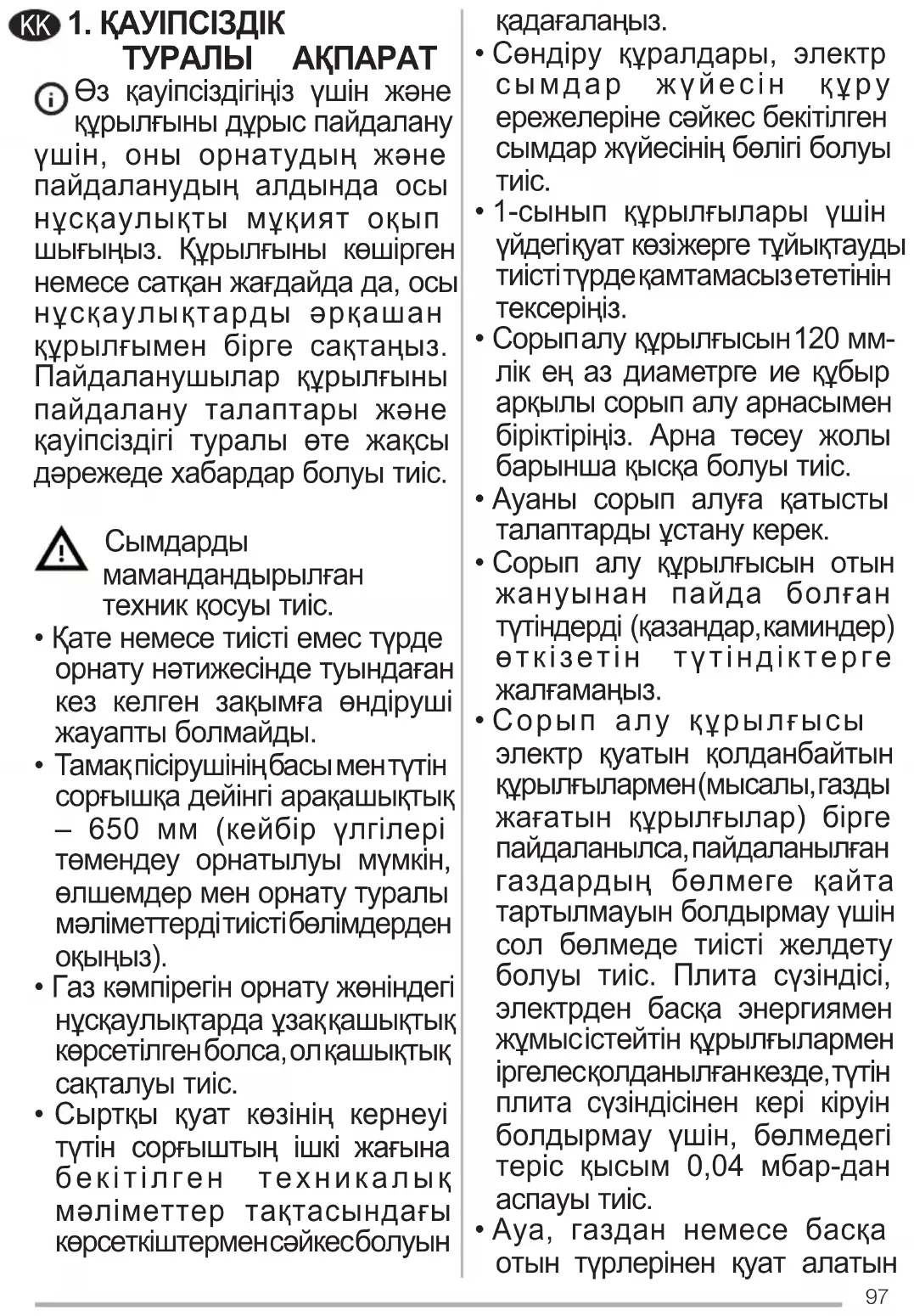 - Сорып алу құрылғысы электр қуатын қолданбайтын құрылғылармен (мысалы, газды жағатын құрылғылар) бірге пайдаланылса, пайдаланылған газдардың бөлмеге қайта тартылмауын болдырмау үшін сол бөлмеде тиісті желдету болуы тиіс. Плита сүзіндісі, электрден басқа энергиямен жұмыс істейтін құрылғылармен іргелес қолданылған кезде, түтін плита сүзіндісінен кері кіруін болдырмау үшін, бөлмедегі теріс қысым 0,04 мбар-дан аспауы тиіс.