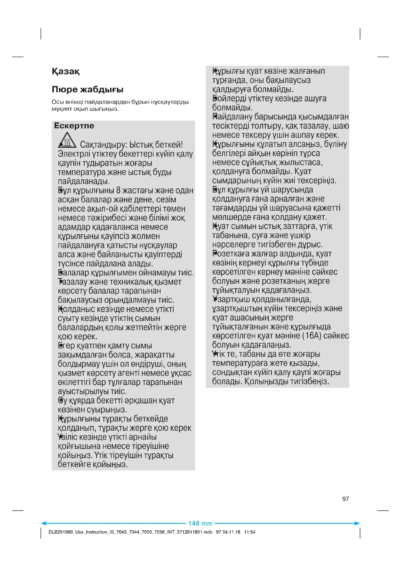 DLB251960_Use_Instruction_IS_7043_7044_7055_7056_INT_5712811851.indb 96 04.11.16 11:54Қазақ Пюре жабдығы Осы өнімді пайдаланардан бұрын нұсқауларды мұқият оқып шығыңыз.