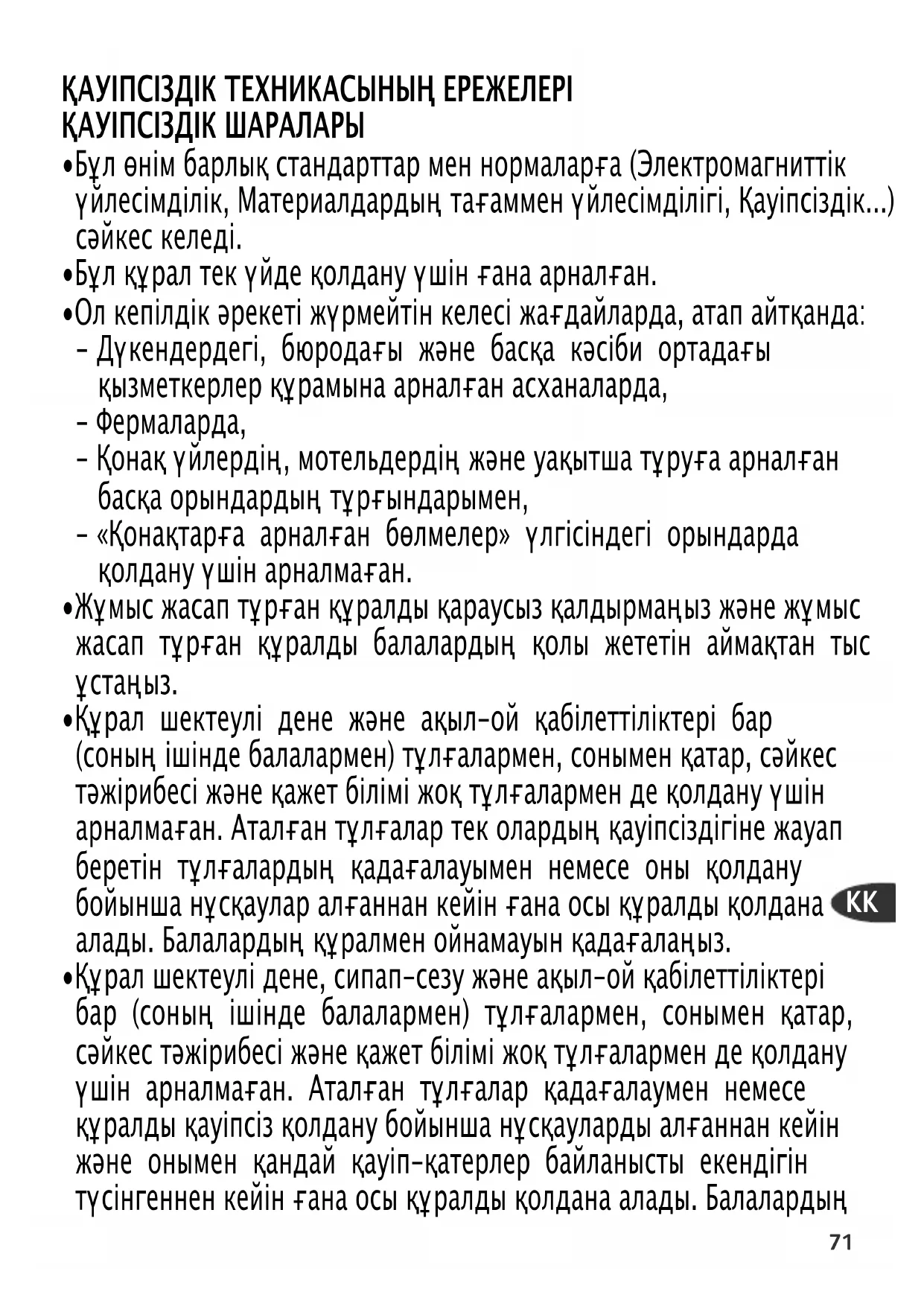 - Құрал шектеулі дене және ақыл-ой қабілеттіліктері бар (соның ішінде балалармен) тұлғалармен, сонымен қатар, сәйкес тәжірибесі және қажет білімі жоқ тұлғалармен де қолдану үшін арналмаған. Аталған тұлғалар тек олардың қауіпсіздігіне жауап беретін тұлғалардың қадағалауымен немесе оны қолдану бойынша нұсқаулар алғаннан кейін ғана осы құралды қолдана алады. Балалардың құралмен ойнамауын қадағалаңыз.