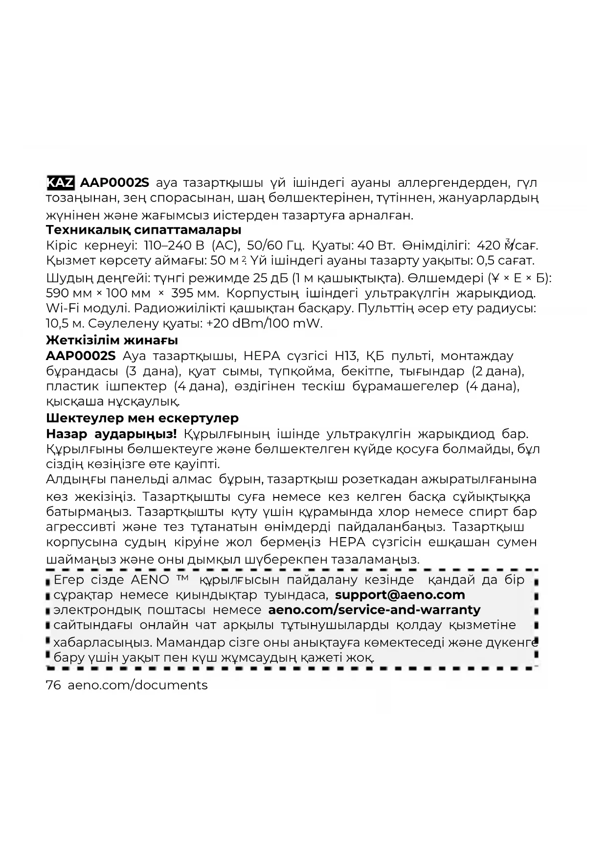 . Үй ішіндегі ауаны тазарту уақыты: 0,5 сағат. Шудың деңгейі: түнгі режимде 25 дБ (1 м қашықтықта). Өлшемдері (Ұ × Е × Б): 590 мм × 100 мм × 395 мм. Корпустың ішіндегі ультракүлгін жарықдиод. Wi-Fi модулі. Радиожиілікті қашықтан басқару. Пульттің әсер ету радиусы: 10,5 м. Сәулелену қуаты: +20 dBm/100 mW. Жеткізілім жинағы AAP0002S Ауа тазартқышы, HEPA сүзгісі H13, ҚБ пульті, монтаждау бұрандасы (3 дана), қуат сымы, түпқойма, бекітпе, тығындар (2 дана), пластик ішпектер (4 дана), өздігінен тескіш бұрамашегелер (4 дана), қысқаша нұсқаулық. Шектеулер мен ескертулер Назар аударыңыз! Құрылғының ішінде ультракүлгін жарықдиод бар. Құрылғыны бөлшектеуге және бөлшектелген күйде қосуға болмайды, бұл сіздің көзіңізге өте қауіпті. Алдыңғы панельді алмас бұрын, тазартқыш розеткадан ажыратылғанына көз жекізіңіз. Тазартқышты суға немесе кез келген басқа сұйықтыққа батырмаңыз. Тазартқышты күту үшін құрамында хлор немесе спирт бар агрессивті және тез тұтанатын өнімдерді пайдаланбаңыз. Тазартқыш корпусына судың кіруіне жол бермеңіз HEPA сүзгісін ешқашан сумен шаймаңыз және оны дымқыл шүберекпен тазаламаңыз. Егер сізде AENO
