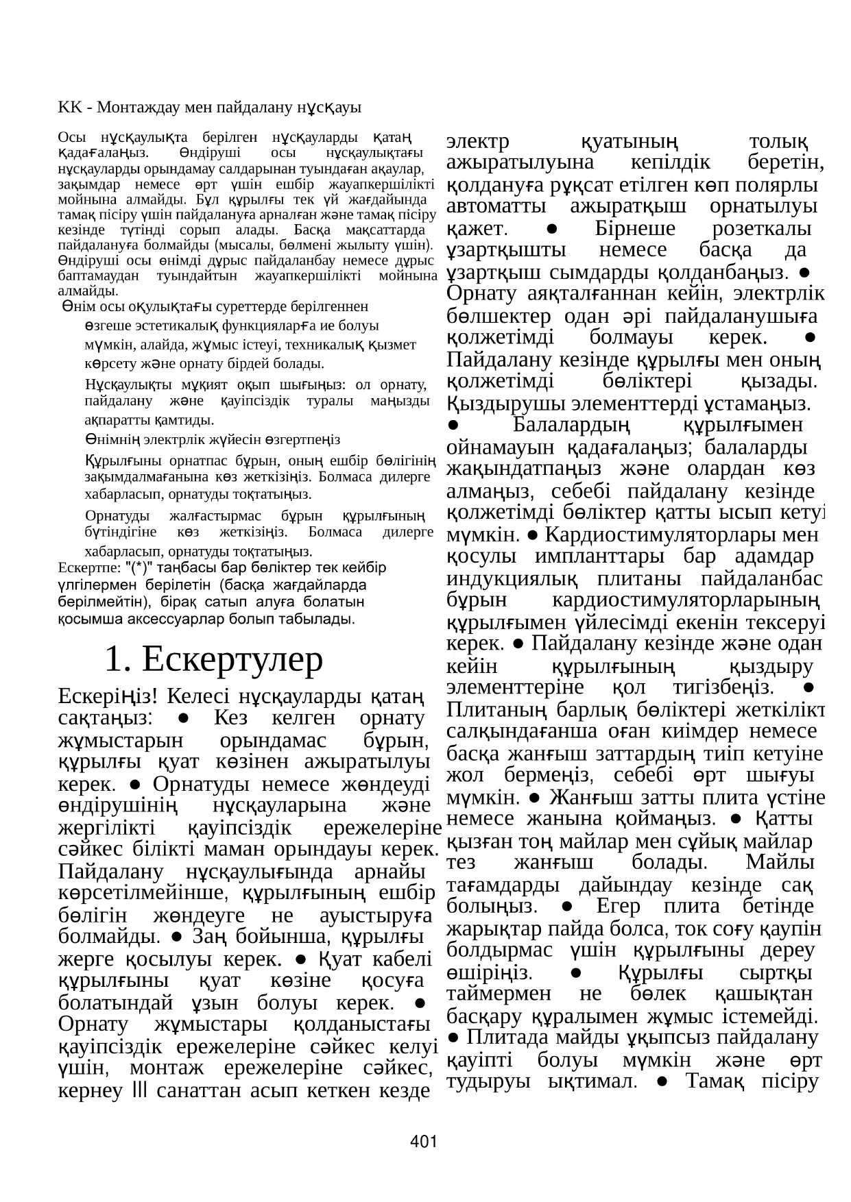 Якщо після вище згаданих перевірок проблему не вдалося усунути, зверніться до найближчої Служби технічної допомоги.401 KK - Монтаждау мен пайдалану нұсқауы Осы нұсқаулықта берілген нұсқауларды қатаң қадағалаңыз. Өндіруші осы нұсқаулықтағы нұсқауларды орындамау салдарынан туындаған ақаулар, зақымдар немесе өрт үшін ешбір жауапкершілікті мойнына алмайды. Бұл құрылғы тек үй жағдайында тамақ пісіру үшін пайдалануға арналған және тамақ пісіру кезінде түтінді сорып алады. Басқа мақсаттарда пайдалануға болмайды (мысалы, бөлмені жылыту үшін). Өндіруші осы өнімді дұрыс пайдаланбау немесе дұрыс баптамаудан туындайтын жауапкершілікті мойнына