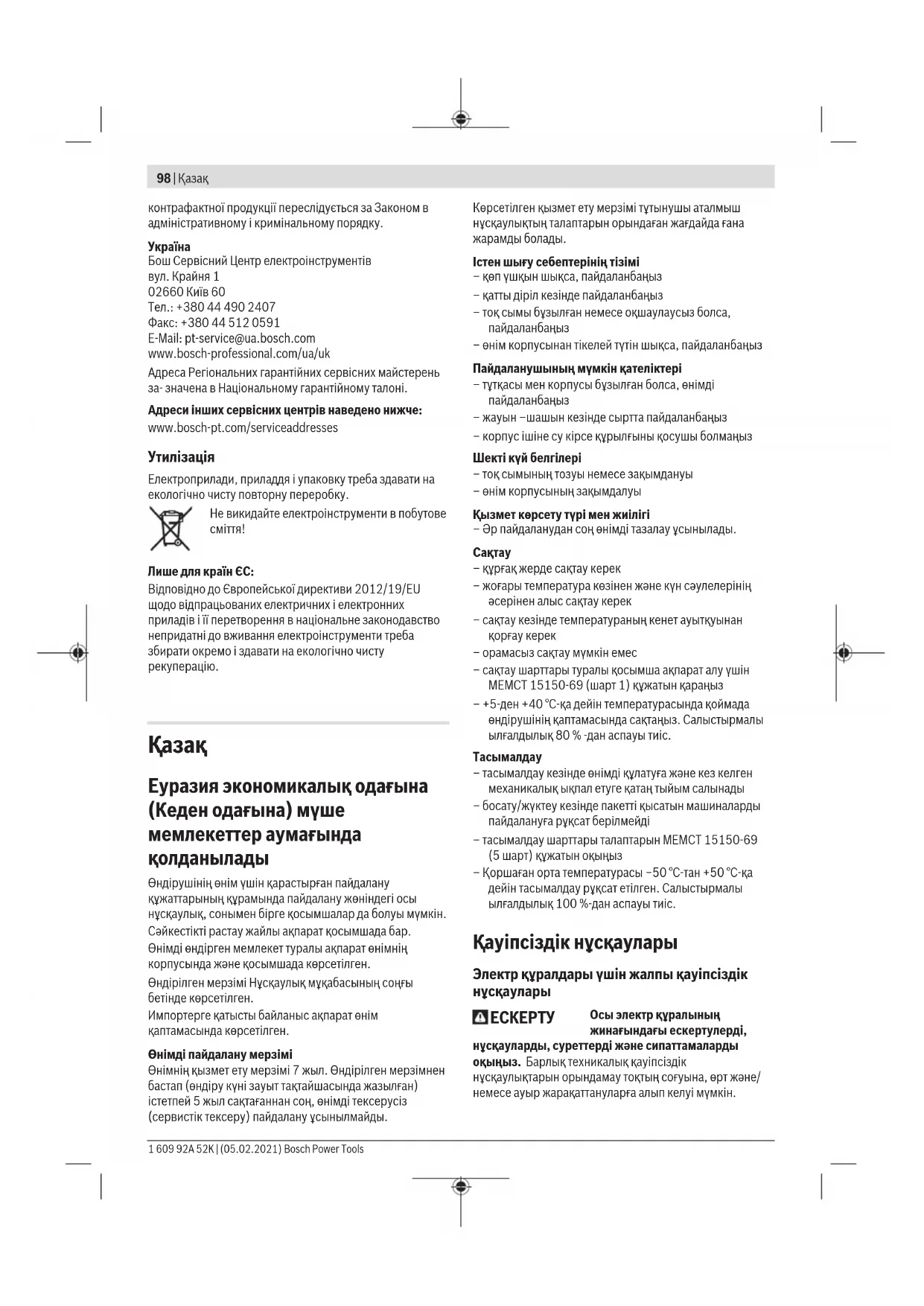 u Кездейсоқ іске қосылудың алдын алу. Тоқ көзіне және/немесе батареялар жинағына қосудан алдын, құралды көтеру немесе тасудан алдын өшіргіш өшік күйде болуына көз жеткізіңіз. Электр құралын саусақты өшіргішке қойып тасу немесе қосқышы қосулы электр құралын тоққа қосу сәтсіз оқиғаға алып келуі мүмкін. u Электр құралын қосудан алдын келген реттеу сынасын немесе кілтті алып қойыңыз. Электр құралының айналатын бөлігінде қалған кілт немесе сына жеке жарақаттануға алып келуі мүмкін. u Көп күш істетпеңіз. Әрдайым тиісті таяныш пен тең салмақытылқты сақтаңыз. Бұл күтілмеген жағдайларда электр құралдың бақылануын сақтайды. u Тиісті киім киіңіз. Бос киім мен әшекейлерді киймеңіз. Шашыңыз бен киімдерді жылжымалы бөлшектерден алыс ұстаңыз. Бос киімдер, әшекейлер немесе ұзын шаш жылжымалы бөлшектер арқылы тартылуы мүмкін. u Егер шаң шығарып жинау жабдықтарына қосу құрылғылары берліген болса, онда олар қосулы болуына және тиісті ретте қолдануына көз жеткізіңіз. Шаң жинауды пайдалану шаңға байланысты зияндарды кемейтеді. u Аспаптарды жиі пайдаланып жақсы білгеннен соң масайрап кетпей қауіпсіздік принциптерін елемей отырмаңыз. Абайсыз әрекет секунд ішінде ауыр жарақаттануға алып келуі мүмкін. u НАЗАР АУДАРЫҢЫЗ! Энергиямен жабдықтаудың толықтай не жекелей тоқтатылуы немесе энергиямен жабдықтауды басқару тізбегінің ақаулануы салдарынан электр құралының жұмысында кідіріс пайда болған жағдайда, бұғатталмағандығына көз жеткізіп (болған жағдайда) барып, ажыратқышты Выкл. (Өшіру) қалпына келтіріңіз. Желілік ашаны розеткадан шығарыңыз немесе алып – салмалы аккумуляторды ажыратыңыз. Осы әрекет арқылы бақыланбайтын қайта іске қосылудың алдын аласыз. u Аталмыш пайдалану жөніндегі нұсқаулыққа сәйкес білікті қызметкерлер құрамына электр құралын реттеу, монтаждау, қолданысқа енгізу және оған қызмет көрсету әрекеттерімен таныс тұлғалар жатады. u Электр құралымен жұмыс істеуге 18 жасқа толған, техникалық сипаттаманы, пайдалану жөніндегі Bosch Power Tools 1 609 92A 52K | (05.02.2021)100 | Қазақ нұсқаулықты және қауіпсіздік ережелерін оқып шыққан тұлғаларға рұқсат етіледі. u Дене, сезім немесе ақыл-ой қабілеттері шектеулі немесе тәжірибесі мен білімі жеткіліксіз адамдар олардың қауіпсіздігі үшін жауапты тұлғаның бақылауында болмаса немесе электр құралын пайдалану бойынша нұсқау алмаған болса, бұйымды пайдаланбауы тиіс. Электр құралдарын пайдалану және күту u Құралды аса көп жүктемеңіз. Жұмысыңыз үшін жарамды электр құралын пайдаланыңыз. Жарамды электр құралымен керекті жұмыс аймағында дұрыс әрі сенімді жұмыс істейсіз. u Ажыратқышы дұрыс емес электр құралын пайдаланбаңыз. Қосуға немесе өшіруге болмайтын электр құралы қауіпті болып, оны жөндеу қажет