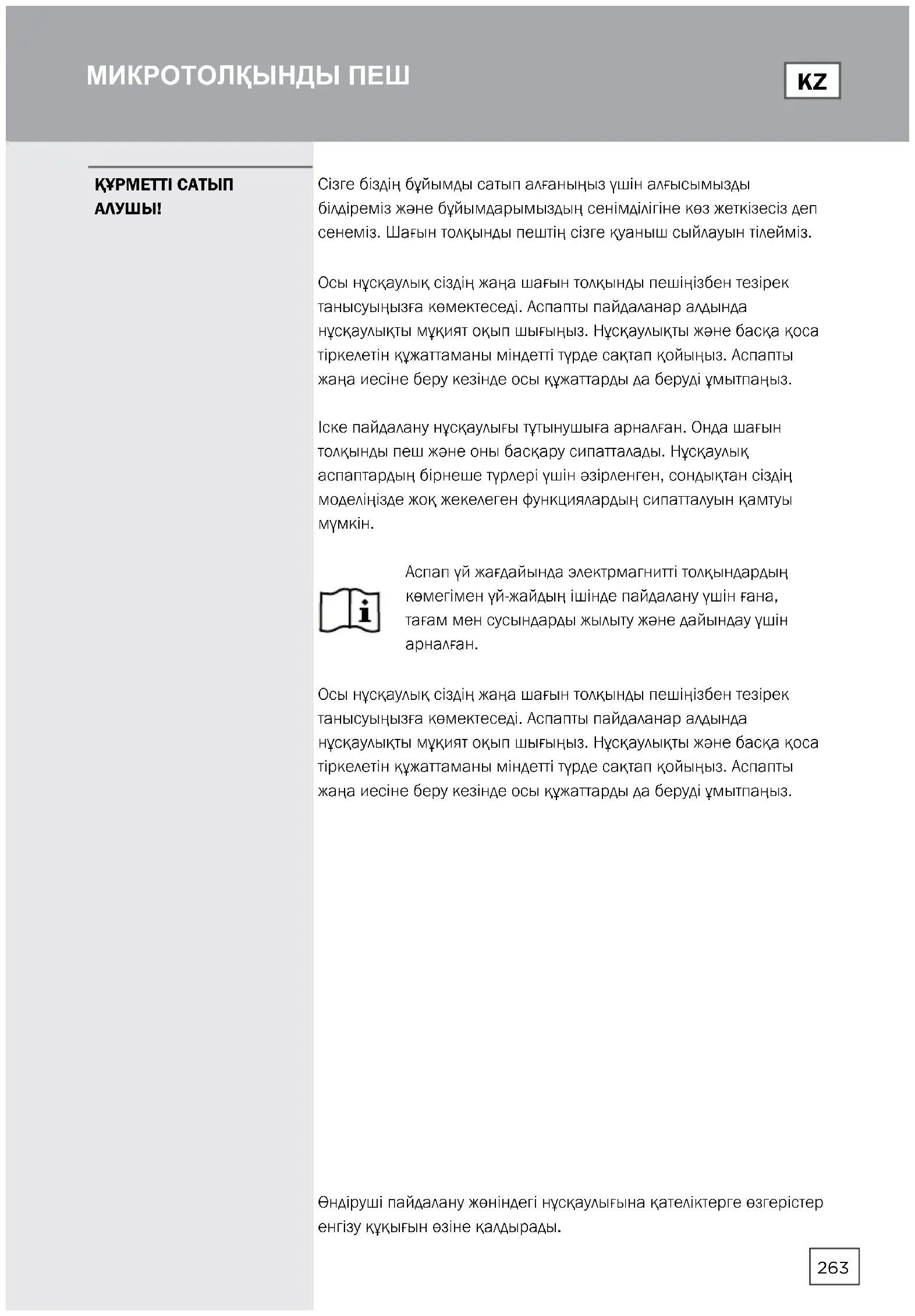 МИКРОТОЛҚЫНДЫ ПЕШ Сізге біздің бұйымды сатып алғаныңыз үшін алғысымызды білдіреміз және бұйымдарымыздың сенімділігіне көз жеткізесіз деп сенеміз. Шағын толқынды пештің сізге қуаныш сыйлауын тілейміз. Осы нұсқаулық сіздің жаңа шағын толқынды пешіңізбен тезірек танысуыңызға көмектеседі. Аспапты пайдаланар алдында нұсқаулықты мұқият оқып шығыңыз. Нұсқаулықты және басқа қоса тіркелетін құжаттаманы міндетті түрде сақтап қойыңыз. Аспапты жаңа иесіне беру кезінде осы құжаттарды да беруді ұмытпаңыз. Іске пайдалану нұсқаулығы тұтынушыға арналған. Онда шағын толқынды пеш және оны басқару сипатталады. Нұсқаулық аспаптардың бірнеше түрлері үшін әзірленген, сондықтан сіздің моделіңізде жоқ жекелеген функциялардың сипатталуын қамтуы