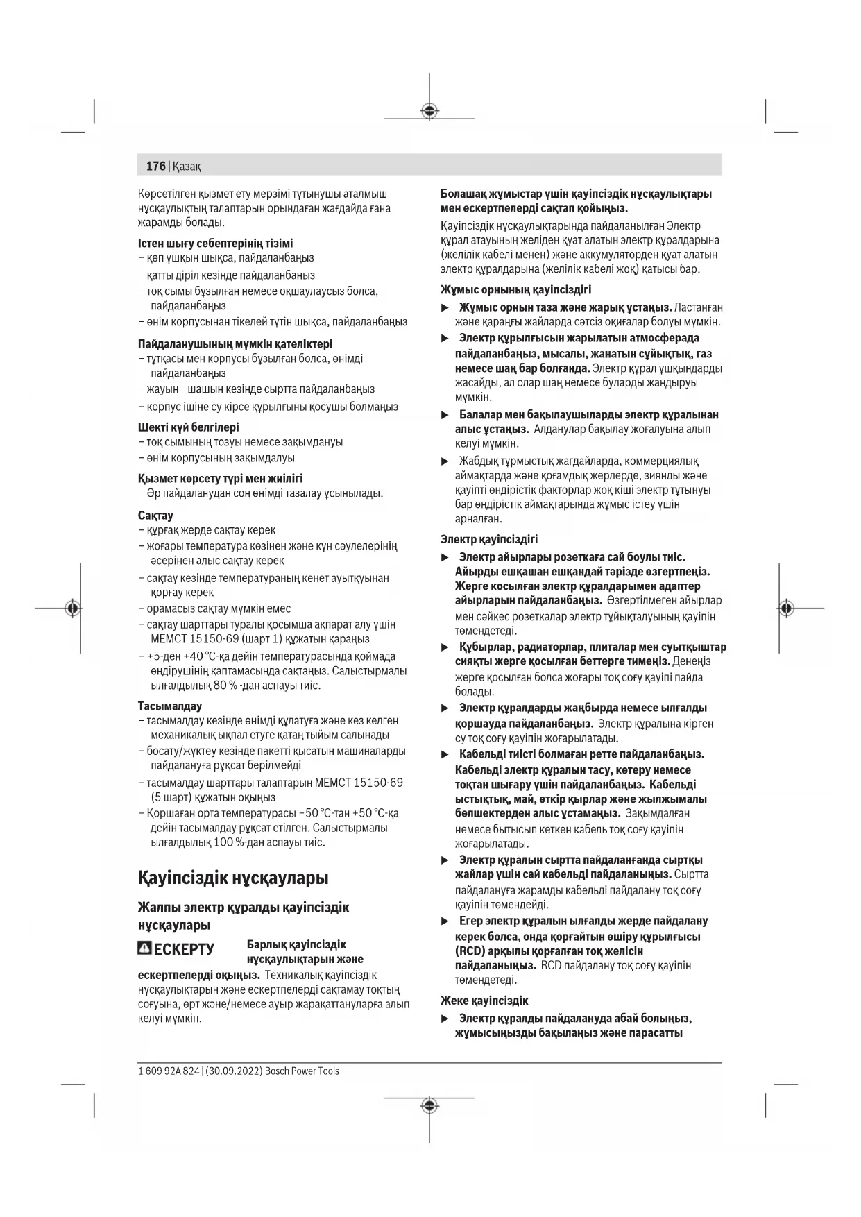Еуразия экономикалық одағына (Кеден одағына) мүше мемлекеттер аумағында қолданылады Өндірушінің өнім үшін қарастырған пайдалану құжаттарының құрамында пайдалану жөніндегі осы нұсқаулық, сонымен бірге қосымшалар да болуы мүмкін. Сəйкестікті растау жайлы ақпарат қосымшада бар. Өнімді өндірген мемлекет туралы ақпарат өнімнің корпусында жəне қосымшада көрсетілген. Өндірілген мерзімі Нұсқаулық мұқабасының соңғы бетінде көрсетілген. Импортерге қатысты байланыс ақпарат өнім қаптамасында көрсетілген. Өнімді пайдалану мерзімі Өнімнің қызмет ету мерзімі 7жыл. Өндірілген мерзімнен бастап (өндіру күні зауыт тақтайшасында жазылған) істетпей 5жыл сақтағаннан соң, өнімді тексерусіз (сервистік тексеру) пайдалану ұсынылмайды. Bosch Power Tools 1 609 92A 824 | (30.09.2022)176 | Қазақ Көрсетілген қызмет ету мерзімі тұтынушы аталмыш нұсқаулықтың талаптарын орындаған жағдайда ғана жарамды болады. Iстен шығу себептерінің тізімі – қөп үшқын шықса, пайдаланбаңыз – қатты діріл кезінде пайдаланбаңыз – тоқ сымы бұзылған немесе оқшаулаусыз болса, пайдаланбаңыз – өнім корпусынан тікелей түтін шықса, пайдаланбаңыз Пайдаланушының мүмкін қателіктері – тұтқасы мен корпусы бұзылған болса, өнімді пайдаланбаңыз – жауын –шашын кезінде сыртта пайдаланбаңыз – корпус ішіне су кірсе құрылғыны қосушы болмаңыз Шекті күй белгілері – тоқ сымының тозуы немесе зақымдануы – өнім корпусының зақымдалуы Қызмет көрсету түрі мен жиілігі – Әр пайдаланудан соң өнімді тазалау ұсынылады.