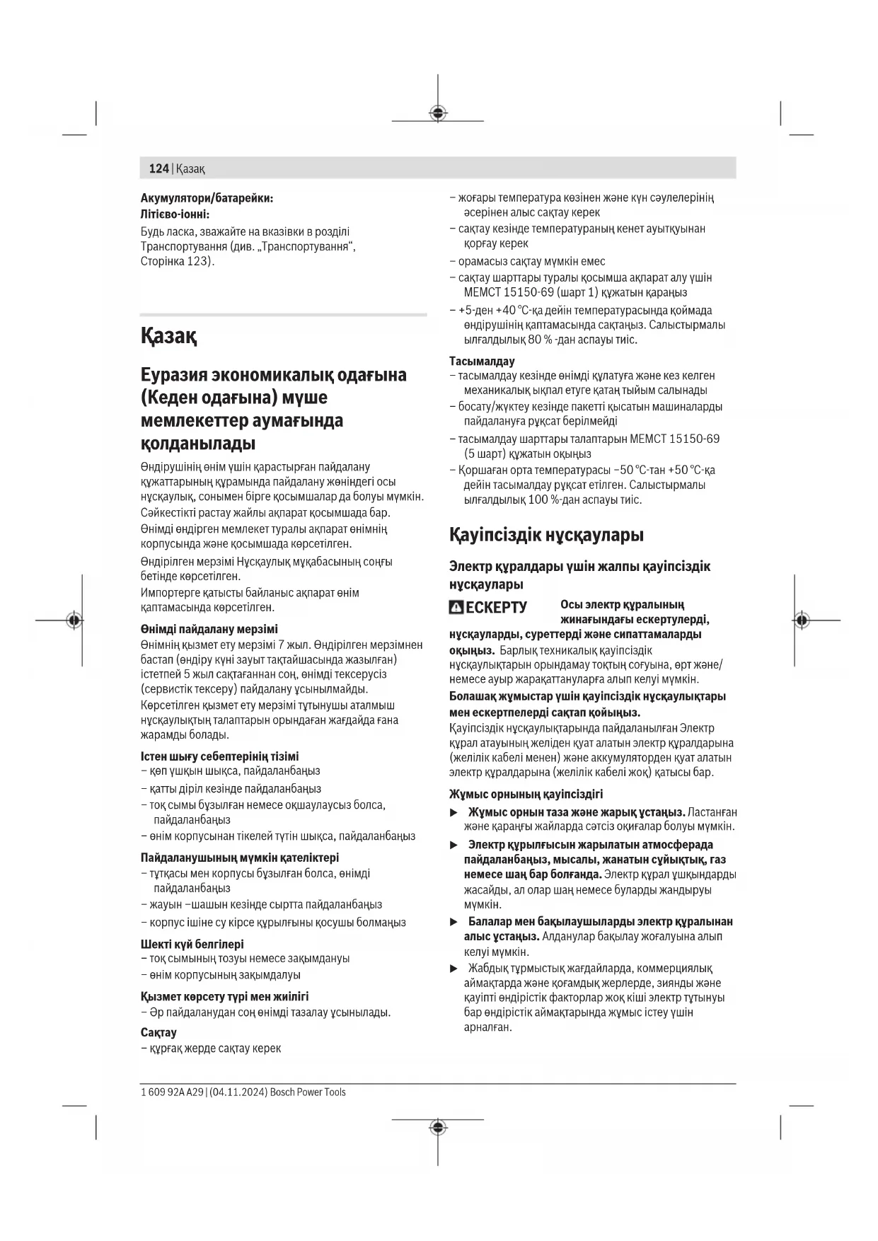 Ұсынылған литий-иондық аккумуляторлар қауіпті тауарларға қойылатын талаптарға бағынады. Пайдаланушы аккумуляторларды көшеде қосымша құжаттарсыз тасымалдай алады. Үшінші тараптар (мысалы, әуе немесе жүк тасымалдау компаниясы) орауышқа және таңбаламаға қойылатын арнайы талаптарды сақтауы керек. Жіберілетін жүкті дайындау кезінде қауіпті жүктерді тасымалдау сарапшыларымен хабарласу керек. Аккумуляторды корпусы зақымдалмаған болса ғана жіберіңіз. Ашық түйіспелерді желімдеңіз және аккумуляторды орамада қозғалмайтындай ораңыз. Қажет болса, қосымша ұлттық ережелерді сақтаңыз. Кәдеге жарату Электр құралдарды, аккумуляторларды, керек-жарақтарды және орау материалдарын экологиялық тұрғыдан дұрыс утилизациялауға тапсыру керек. Электр құралдарды және аккумуляторларды/батареяларды үй қоқысына тастамаңыз! Тек қана ЕО елдері үшін: Әрі қарай пайдалануға жарамайтын электр құралдарын және ақаулы немесе тозып біткен аккумуляторларды/ батареяларды бөлек кәдеге жарату керек. Арнайы қоқыс жинау жүйелерін пайдаланыңыз. Bosch Power Tools 1 609 92A A29 | (04.11.2024)132 | Română Лайықсыз түрде кәдеге жаратылған жағдайда, ескі электр және электрондық құралдар, оларда қауіпті заттардың бар болуы ықтималдығы себебінен, қоршаған ортаға және адамдардың денсаулығына қауіпті түрде әсер етуі