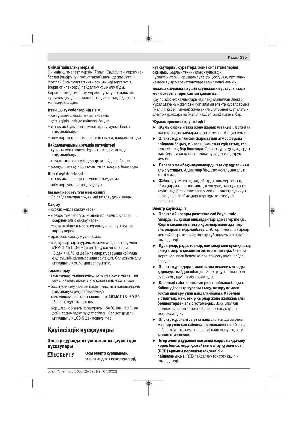 Еуразия экономикалық одағына (Кеден одағына) мүше мемлекеттер аумағында қолданылады Өндірушінің өнім үшін қарастырған пайдалану құжаттарының құрамында пайдалану жөніндегі осы нұсқаулық, сонымен бірге қосымшалар да болуы мүмкін. Сəйкестікті растау жайлы ақпарат қосымшада бар. Өнімді өндірген мемлекет туралы ақпарат өнімнің корпусында жəне қосымшада көрсетілген. Өндірілген мерзімі Нұсқаулық мұқабасының соңғы бетінде көрсетілген. Импортерге қатысты байланыс ақпарат өнім қаптамасында көрсетілген. 1 609 92A 6Y3 | (27.07.2022) Bosch Power ToolsҚазақ | 195 Өнімді пайдалану мерзімі Өнімнің қызмет ету мерзімі 7жыл. Өндірілген мерзімнен бастап (өндіру күні зауыт тақтайшасында жазылған) істетпей 5жыл сақтағаннан соң, өнімді тексерусіз (сервистік тексеру) пайдалану ұсынылмайды. Көрсетілген қызмет ету мерзімі тұтынушы аталмыш нұсқаулықтың талаптарын орындаған жағдайда ғана жарамды болады. Iстен шығу себептерінің тізімі – қөп үшқын шықса, пайдаланбаңыз – қатты діріл кезінде пайдаланбаңыз – тоқ сымы бұзылған немесе оқшаулаусыз болса, пайдаланбаңыз – өнім корпусынан тікелей түтін шықса, пайдаланбаңыз Пайдаланушының мүмкін қателіктері – тұтқасы мен корпусы бұзылған болса, өнімді пайдаланбаңыз – жауын –шашын кезінде сыртта пайдаланбаңыз – корпус ішіне су кірсе құрылғыны қосушы болмаңыз Шекті күй белгілері – тоқ сымының тозуы немесе зақымдануы – өнім корпусының зақымдалуы Қызмет көрсету түрі мен жиілігі – Әр пайдаланудан соң өнімді тазалау ұсынылады.