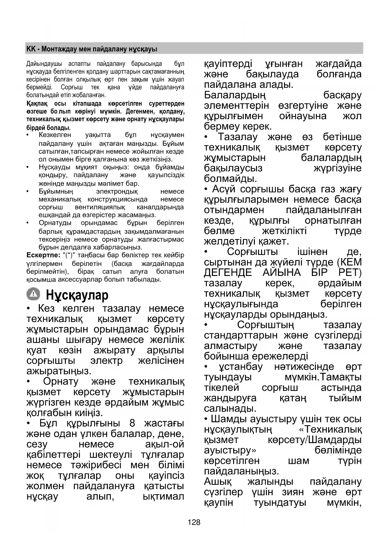 - Бұл құрылғыны 8 жастағы жəне одан үлкен балалар, дене, сезу немесе ақыл-ой қабілеттері шектеулі тұлғалар немесе тəжірибесі мен білімі жоқ тұлғалар оны қауіпсіз жолмен пайдалануға қатысты нұсқау алып, ықтимал қауіптерді ұғынған жағдайда жəне бақылауда болғанда пайдалана алады. Балалардың басқару элементтерін өзгертуіне жəне құрылғымен ойнауына жол бермеу керек.