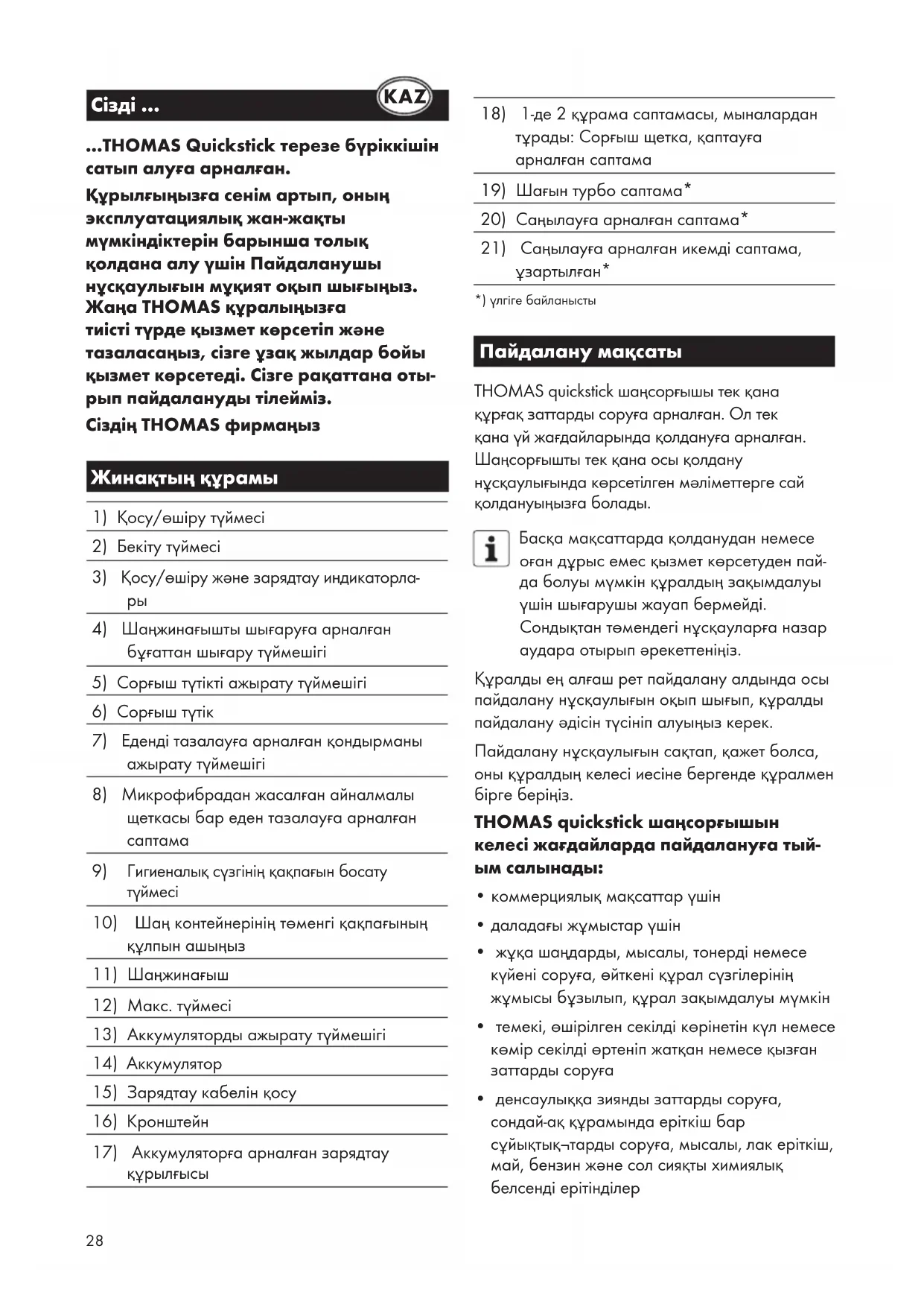 - денсаулыққа зиянды заттарды соруға, сондай-ақ құрамында еріткіш бар сұйықтық¬тарды соруға, мысалы, лак еріткіш, май, бензин және сол сияқты химиялық белсенді ерітінділер KAZ29 THOMAS quickstick шаңсорғышын жарылу қаупі бар ғимараттарда пайдалануға тыйым салынады. Назар аударыңыз! Осы нұсқауларды орындамау құралдың бұзылуына және/ немесе адамдардың зақымдануына әкелуі мүмкін. Ақпарат. Бұл нұсқаулар құралды оңтайлы түрде қолдануға арналған. Техникалық қауіпсіздік