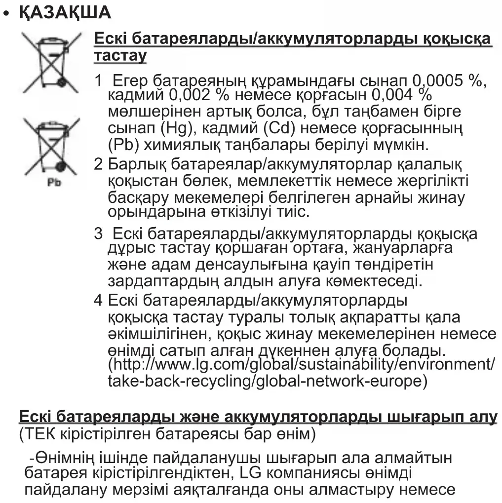 1 Егер батареяның құрамындағы сынап 0,0005 %, кадмий 0,002 % немесе қорғасын 0,004 % мөлшерінен артық болса, бұл таңбамен бірге сынап (Hg), кадмий (Cd) немесе қорғасынның (Pb) химиялық таңбалары берілуі мүмкін. 2 Барлық батареялар/аккумуляторлар қалалық қоқыстан бөлек, мемлекеттік немесе жергілікті басқару мекемелері белгілеген арнайы жинау орындарына өткізілуі тиіс. 3 Ескі батареяларды/аккумуляторларды қоқысқа дұрыс тастау қоршаған ортаға, жануарларға және адам денсаулығына қауіп төндіретін зардаптардың алдын алуға көмектеседі. 4 Ескі батареяларды/аккумуляторларды қоқысқа тастау туралы толық ақпаратты қала әкімшілігінен, қоқыс жинау мекемелерінен немесе өнімді сатып алған дүкеннен алуға болады. (http://www.lg.com/global/sustainability/environment/ take-back-recycling/global-network-europe) Ескі батареяларды және аккумуляторларды шығарып алу (ТЕК кірістірілген батареясы бар өнім) -Өнімнің ішінде пайдаланушы шығарып ала алмайтын батарея кірістірілгендіктен, LG компаниясы өнімді пайдалану мерзімі аяқталғанда оны алмастыру немесеқайта өңдеу үшін батареяны тек білікті маманның шығарып алуына кеңес береді. Өнімді зақымдап алмас үшін және өз қауіпсіздігі үшін пайдаланушы батареяны шығарып алуға тырыспағаны дұрыс және LG Service Helpline қызметіне немесе көмек алу үшін басқа жеке қызмет көрсету провайдеріне хабарласқаны жөн. -Батареяны шығарып алу үшін өнімді бөлшектеу, кабельдердің/түйіспелерінің байланысын ажырату және батарея ұясын арнайы құралдармен абайлап алу керек. Батареяны қауіпсіз шығарып алу бойынша білікті маманның нұсқауы қажет болса, http://www.lge.com/global/sustainability/ environment/take-back-recycling бетіне кіріңіз.