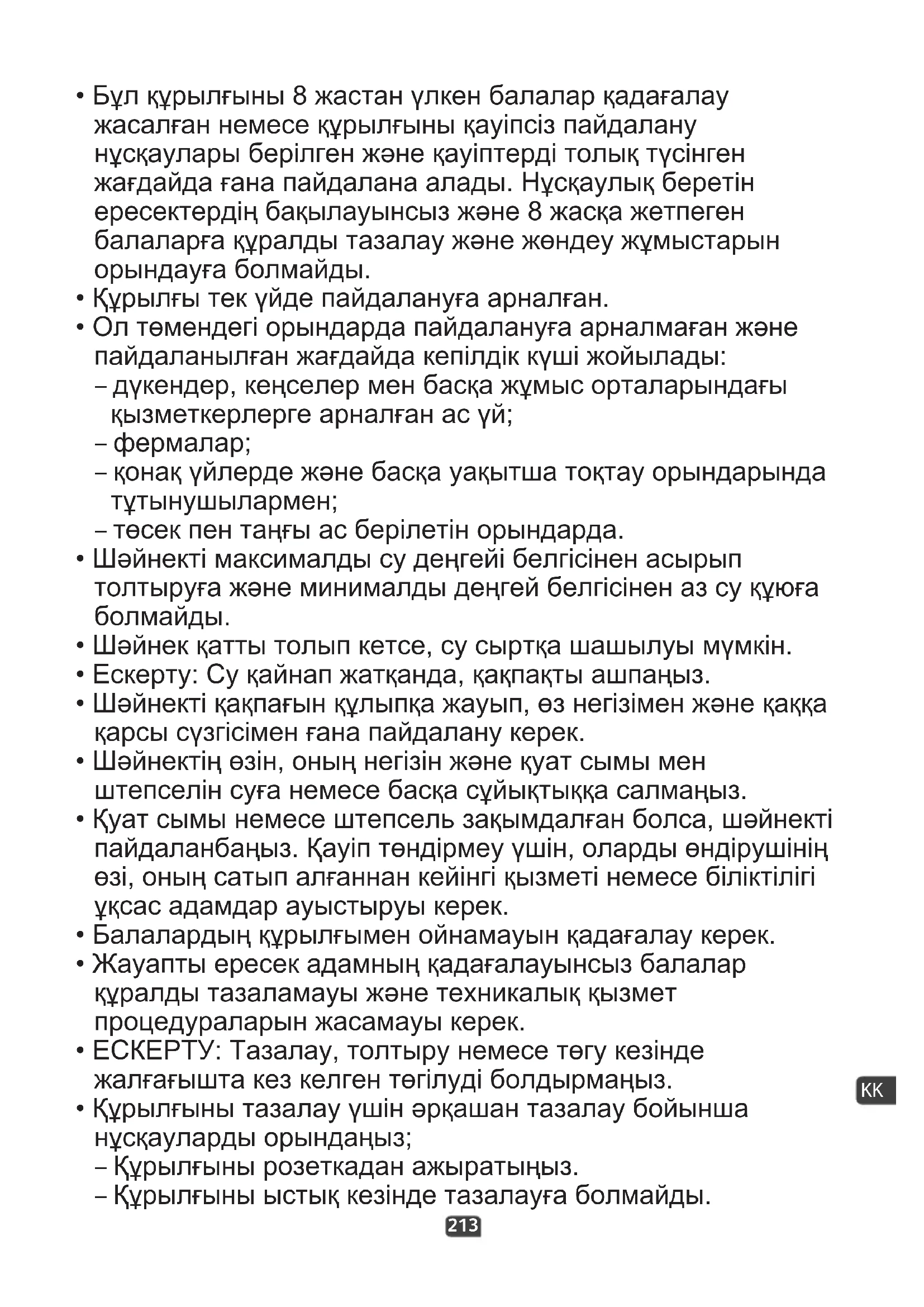 - Құрылғыны тазалау үшін әрқашан тазалау бойынша нұсқауларды орындаңыз; – Құрылғыны розеткадан ажыратыңыз. – Құрылғыны ыстық кезінде тазалауға болмайды. KK214 – Дымқыл шүберекпен немесе губкамен тазалаңыз. – Құрылғыны ешқашан суға батырмаңыз немесе ағып жатқан судың астына қоймаңыз.