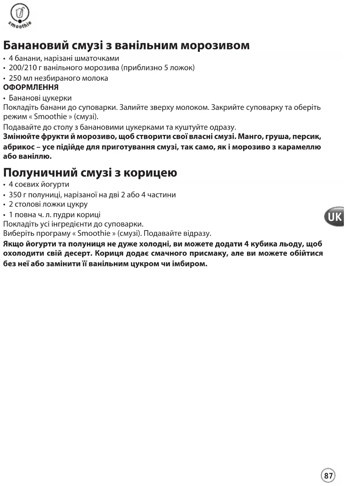 - 1 толы ас қасық үгілген даршын Сорпа әзірлегішке барлық ингредиенттерді салыңыз. « smoothie » (араластыру) параметрін таңдаңыз. Бірден беріңіз. Йогурттар және құлпынайлар суымаса, смузиді дұрыс температураға әкелу үшін 4 мұз текшесін қосуға болады. Даршын смузиге тәтті дәм береді, бірақ, қаласаңыз, оны қоспасаңыз болады және оны ваниль қантымен немесе үгілген зімбірмен ауыстыруға болады.97