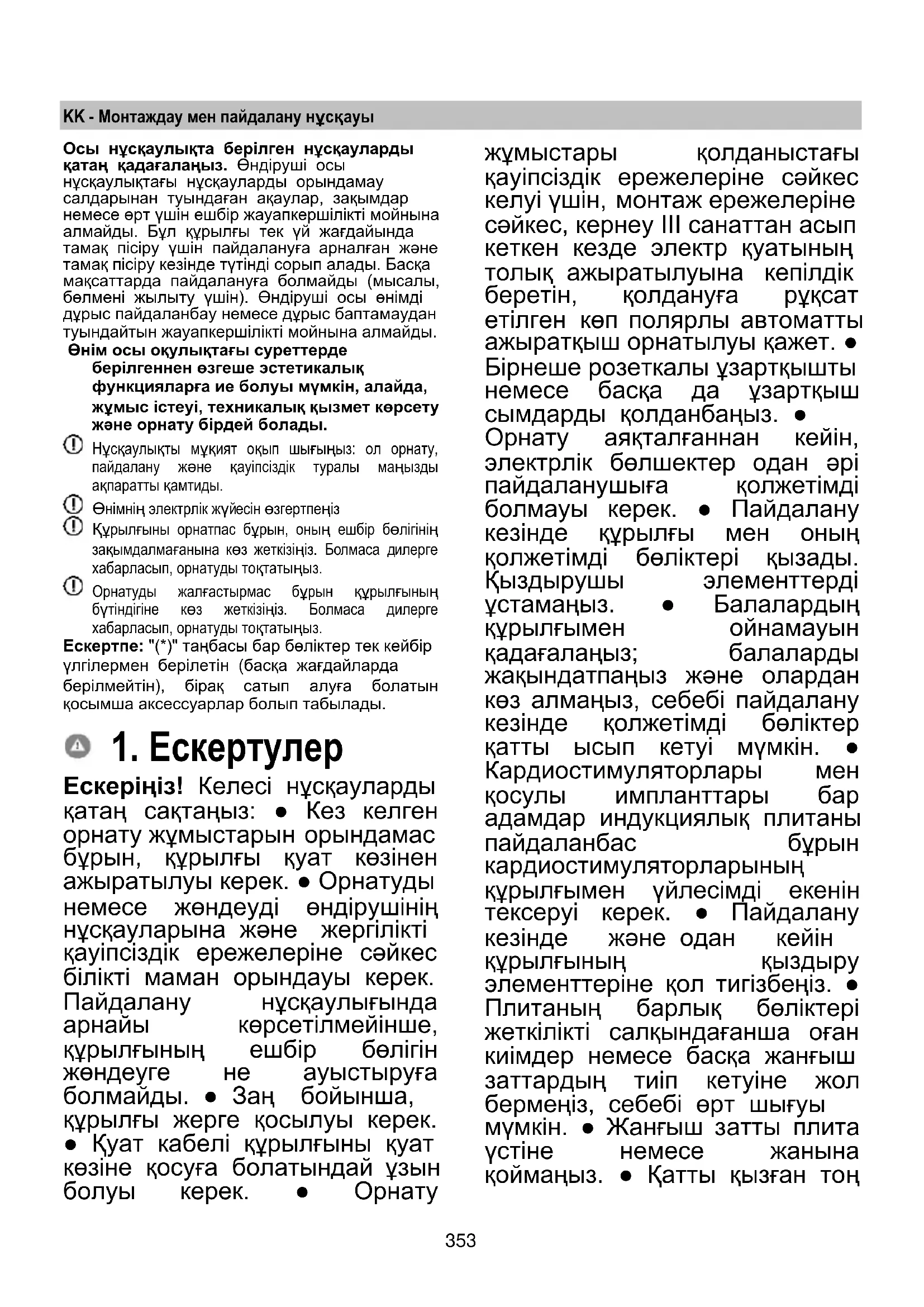Ескеріңіз! Келесі нұсқауларды қатаң сақтаңыз: ● Кез келген орнату жұмыстарын орындамас бұрын, құрылғы қуат көзінен ажыратылуы керек. ● Орнатуды немесе жөндеуді өндірушінің нұсқауларына және жергілікті қауіпсіздік ережелеріне сәйкес білікті маман орындауы керек. Пайдалану нұсқаулығында арнайы көрсетілмейінше, құрылғының ешбір бөлігін жөндеуге не ауыстыруға болмайды. ● Заң бойынша, құрылғы жерге қосылуы керек. ● Қуат кабелі құрылғыны қуат көзіне қосуға болатындай ұзын болуы керек. ● Орнату жұмыстары қолданыстағы қауіпсіздік ережелеріне сәйкес келуі үшін, монтаж ережелеріне сәйкес, кернеу III санаттан асып кеткен кезде электр қуатының толық ажыратылуына кепілдік беретін, қолдануға рұқсат етілген көп полярлы автоматты ажыратқыш орнатылуы қажет. ● Бірнеше розеткалы ұзартқышты немесе басқа да ұзартқыш сымдарды қолданбаңыз. ● Орнату аяқталғаннан кейін, электрлік бөлшектер одан әрі пайдаланушыға қолжетімді болмауы керек. ● Пайдалану кезінде құрылғы мен оның қолжетімді бөліктері қызады. Қыздырушы элементтерді ұстамаңыз. ● Балалардың құрылғымен ойнамауын қадағалаңыз; балаларды жақындатпаңыз және олардан көз алмаңыз, себебі пайдалану кезінде қолжетімді бөліктер қатты ысып кетуі мүмкін. ● Кардиостимуляторлары мен қосулы импланттары бар адамдар индукциялық плитаны пайдаланбас бұрын кардиостимуляторларының құрылғымен үйлесімді екенін тексеруі керек. ● Пайдалану кезінде және одан кейін құрылғының қыздыру элементтеріне қол тигізбеңіз. ● Плитаның барлық бөліктері жеткілікті салқындағанша оған киімдер немесе басқа жанғыш заттардың тиіп кетуіне жол бермеңіз, себебі өрт шығуы мүмкін. ● Жанғыш затты плита үстіне немесе жанына қоймаңыз. ● Қатты қызған тоң354 майлар мен сұйық майлар тез жанғыш болады. Майлы тағамдарды дайындау кезінде сақ болыңыз. ● Егер плита бетінде жарықтар пайда болса, ток соғу қаупін болдырмас үшін құрылғыны дереу өшіріңіз. ● Құрылғы сыртқы таймермен не бөлек қашықтан басқару құралымен жұмыс істемейді. ● Плитада майды ұқыпсыз пайдалану қауіпті болуы мүмкін және өрт тудыруы ықтимал. ● Тамақ пісіру процесін қадағалап тұру қажет. Қысқа пісіру процесі үнемі бақылануы қажет. ● Өртті ЕШҚАШАН сумен өшіру әрекетін жасауға болмайды. Оның орнына құрылғыны өшіріп, өртті қақпақ не шүберек клеенка сияқты нәрсемен жабыңыз. Өрт қаупі бар: плита бетіне бөгде заттарды қоймаңыз. ● Бу тазартқыштарды пайдаланбаңыз, ток соғу қаупі бар. ● Пышақтар, шанышқылар, қасықтар немесе қақпақтар сияқты металл заттарды пешке қоймаңыз, себебі олар қызып кетуі мүмкін. ● Құрылғыны электр желісіне қоспас бұрын: кернеу мен қуаттың электр желісіне сәйкес келетіндігіне және розеткаға сәйкес келетіндігіне көз жеткізу үшін мәліметтер тақтасын (құрылғының төменгі жағында) тексеріңіз. Күмәніңіз болса, білікті электр маманымен