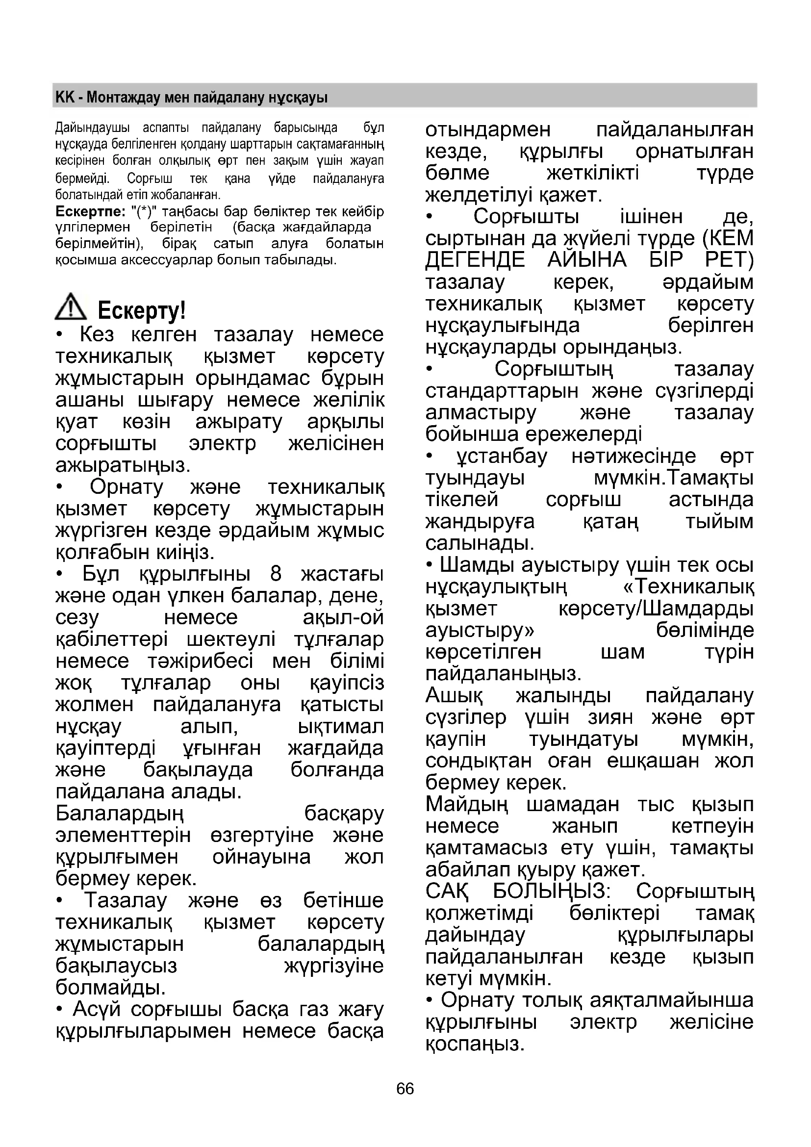 - Бұл құрылғыны 8 жастағы жəне одан үлкен балалар, дене, сезу немесе ақыл-ой қабілеттері шектеулі тұлғалар немесе тəжірибесі мен білімі жоқ тұлғалар оны қауіпсіз жолмен пайдалануға қатысты нұсқау алып, ықтимал қауіптерді ұғынған жағдайда жəне бақылауда болғанда пайдалана алады. Балалардың басқару элементтерін өзгертуіне жəне құрылғымен ойнауына жол бермеу керек.