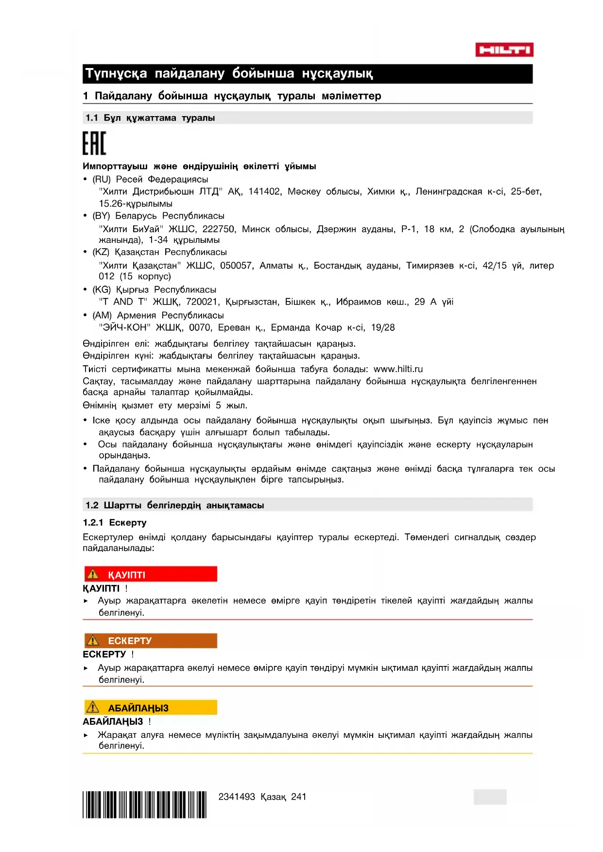 - (AM) Армения Республикасы "ЭЙЧ-КОН" ЖШҚ, 0070, Ереван қ., Ерманда Кочар к-сі, 19/28 Өндірілген елі: жабдықтағы белгілеу тақтайшасын қараңыз. Өндірілген күні: жабдықтағы белгілеу тақтайшасын қараңыз. Тиісті сертификатты мына мекенжай бойынша табуға болады: www.hilti.ru Сақтау, тасымалдау және пайдалану шарттарына пайдалану бойынша нұсқаулықта белгіленгеннен басқа арнайы талаптар қойылмайды. Өнімнің қызмет ету мерзімі 5 жыл.