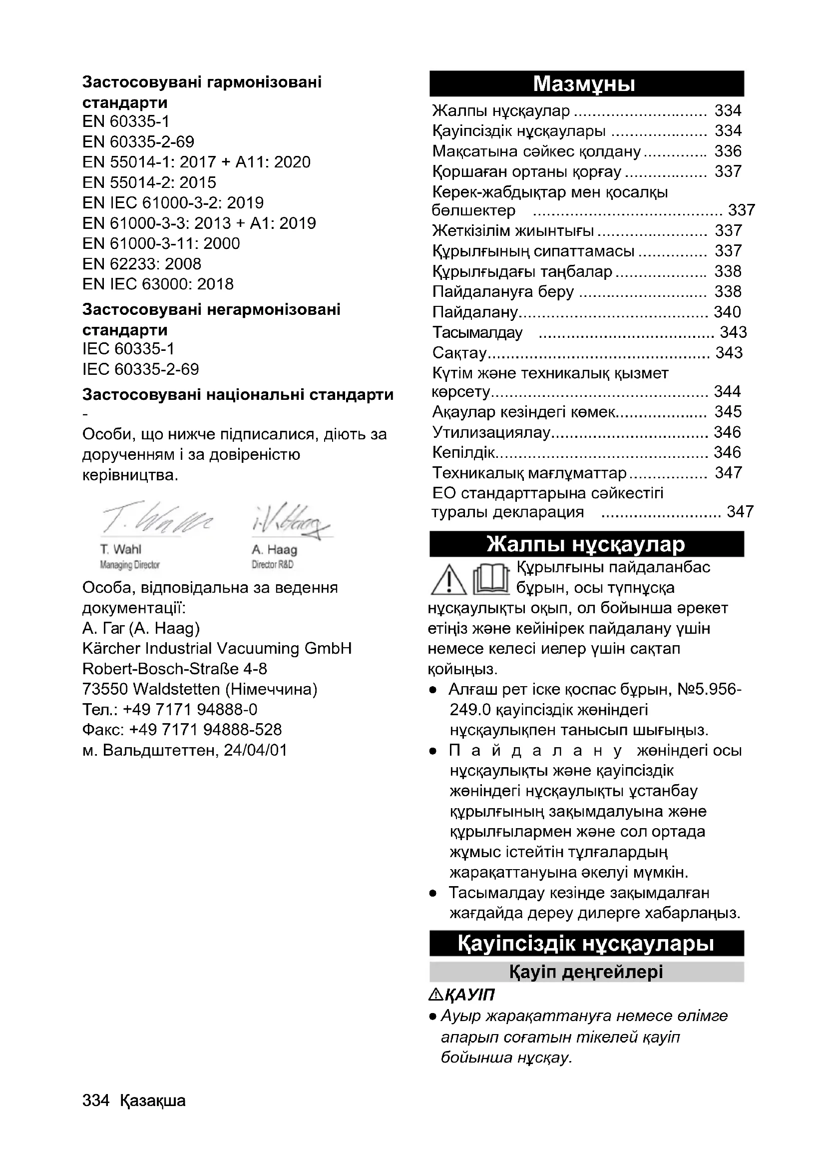 - Қауіпсіздік нұсқаулары p. 334