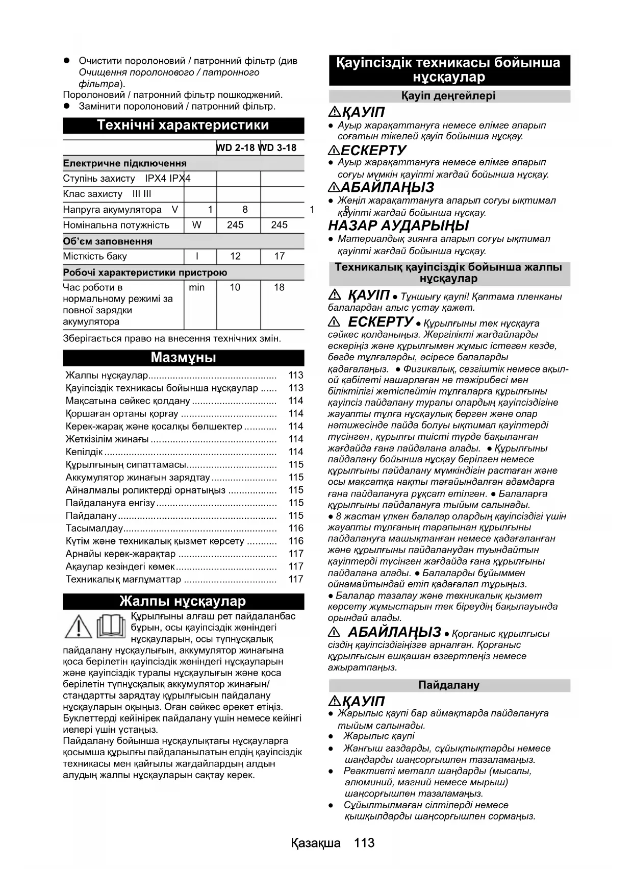 - ● Жарылыс қаупі бар аймақтарда пайдалануға тыйым салынады. ● Жарылыс қаупі ● Жанғыш газдарды, сұйықтықтарды немесе шаңдарды шаңсорғышпен тазаламаңыз. ● Реактивті металл шаңдарды (мысалы, алюминий, магний немесе мырыш) шаңсорғышпен тазаламаңыз. ● Сұйылтылмаған сілтілерді немесе қышқылдарды шаңсорғышпен сормаңыз. WD 2-18 WD 3-18 Електричне підключення Ступінь захисту IPX4 IPX4 Клас захисту III III Напруга акумулятора V18 18 Номінальна потужність W 245 245 Об’єм заповнення Місткість баку l12 17 Робочі характеристики пристрою Час роботи в нормальному режимі за повної зарядки акумулятора min 10 18 Жалпы нұсқаулар p. 113
