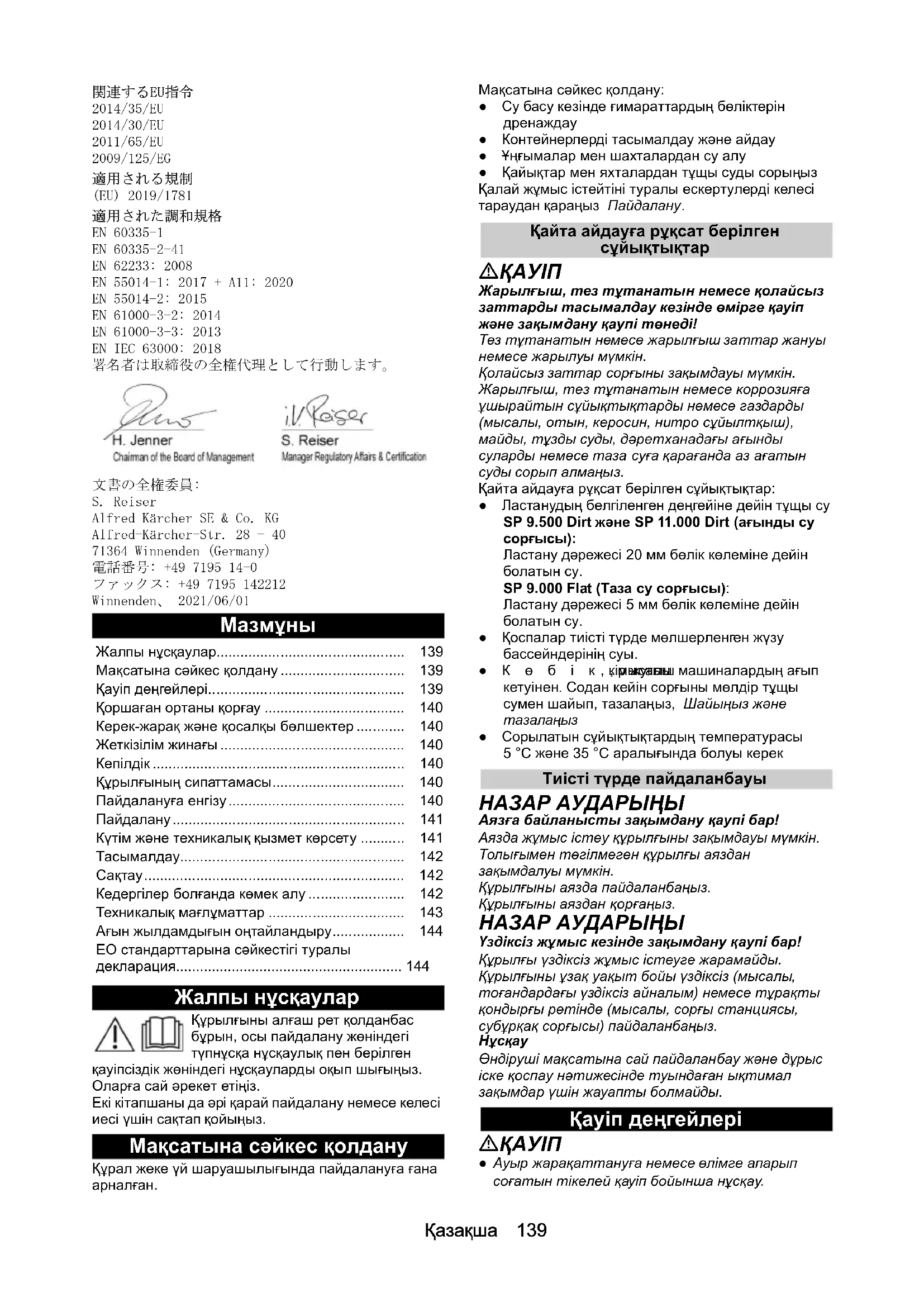 ● пайдаланылатын шлангінің қысқа болуы. ● жалғанған керек-жарақтан қысым жоғалуы қаншалықты аз орын алуы. ЕО стандарттарына сəйкестігі туралы декларация Осымен төменде көрсетілген машина қауіпсіздік жəне денсаулық қорғау бойынша ЕО директиваларының талаптарына сəйкес келетіні мəлімдейміз. Бізбен келісусіз машинаның конструкциясы өзгерген жағдайда осы декларация өз күшін жояды. Бұйым: Сорғы Типі: 1.645-xxx Қолданыстағы ЕО директивалары 2014/35/ЕС 2014/30/EU 2011/65/EU 2009/125/EG Қолданылатын нұсқама(лар) (ЕО) 2019/1781 Қолданылатын біріздендірілген стандарттар EN 60335-1 EN 60335-2-41 EN 62233: 2008 EN 55014-1: 2017 + A11: 2020 EN 55014-2: 2015 EN 61000-3-2: 2014 EN 61000-3-3: 2013 EN IEC 63000: 2018 Қол қойғандар басқарманың тапсырмасы мен уəкілдігі бойынша əрекет